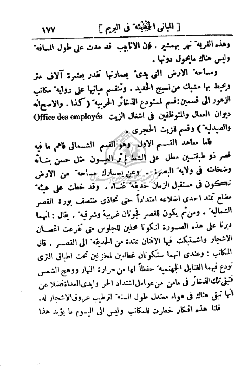 ومساحة الأرض التي بدئ بعمارتها تقدر بعشرة آلاف متر ويحيط بها مشبك من نسيج الحديد. وتنقسم مبانيها على رواية مكاتب الزهور إلى قسمين: قسم لمستودع الذخائر الحربية (كذا. والأصح انه ديوان العمال والمتوظفين في أشغال الزيت والصيدلية) وقسم للزيت الحجري.