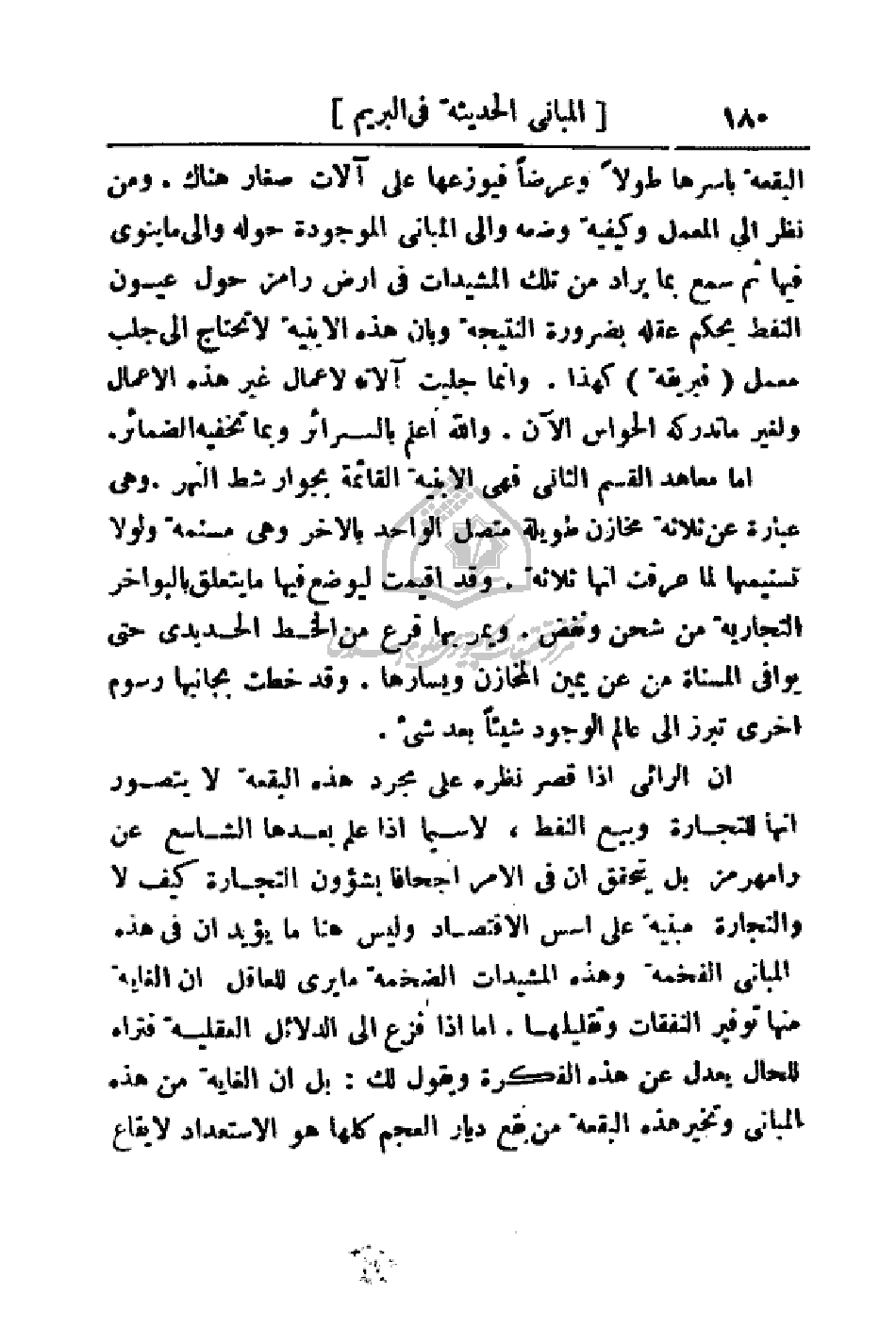 البقعة بآسرها طولاً وعرضاً فيوزعها على آلات صغار هناك. ومن نظر إلى المعمل وكيفية وضعه وإلى المباني الموجودة حوله وإلى ينوى فيها ثم سمع بما يراد من تلك المشيدات في أرض رامز حول عيون النفط يحكم عقله بضرورة النتيجة وبان هذه الأبنية لا تحتاج إلى جلب معمل (فبريقة) كهذا. وإنما جلبت