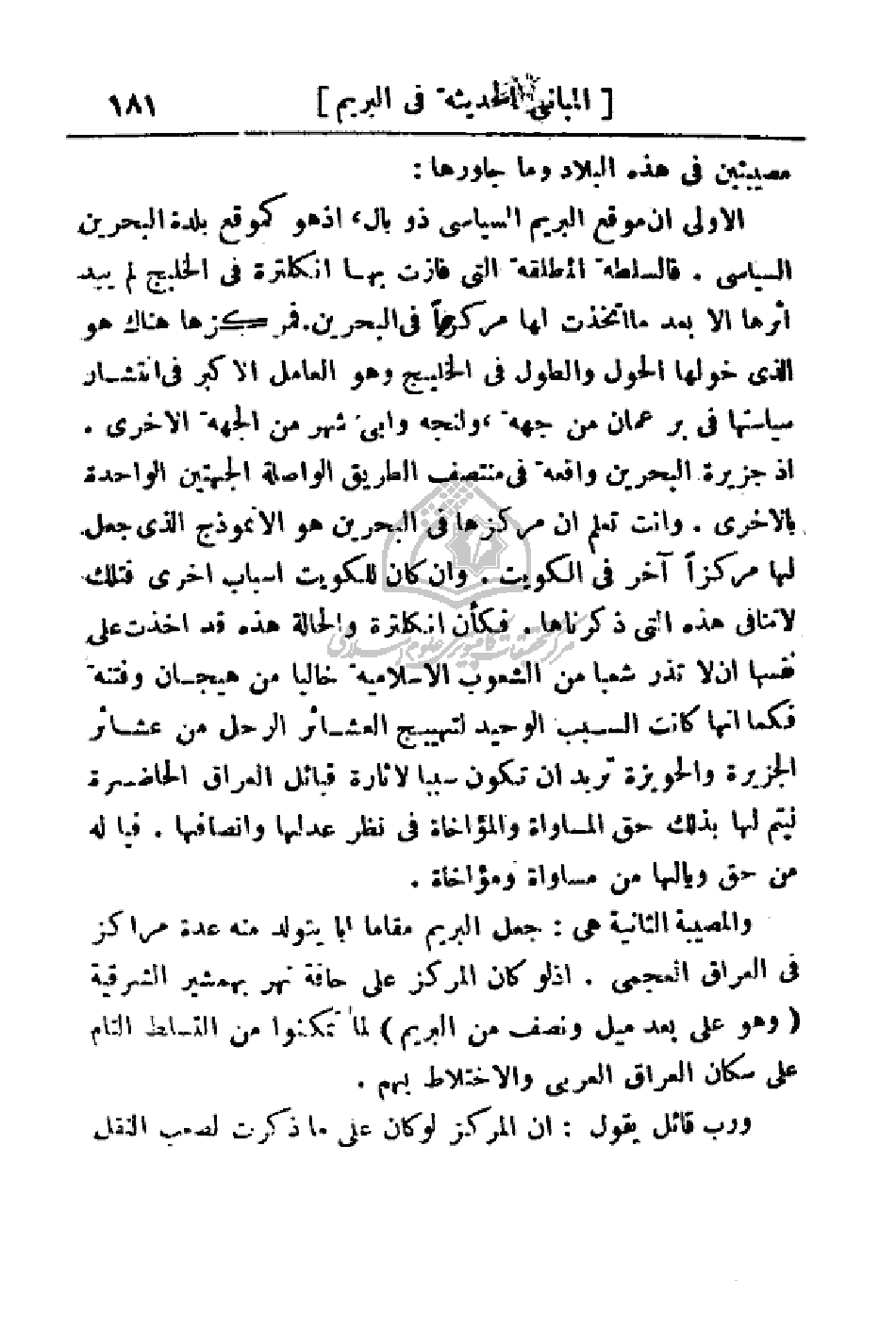 الأولى أن موقع البريم السياسي ذو بال، إذ هو كموقع بلدة البحرين السياسي. فالسلطة المطقة التي فازت بها إنكلترا في الخليج لم يبد آثرها إلا بعد ما اتخذت لها مركزاً في البحرين. فمركزها هناك هو الذي خولها الحول والطول في الخليج وهو العامل الأكبر في انتشار سياستها في بر عمان من جهة، ولنجه وأبي شهر من الجهة الأخرى. إذ أن جزيرة البحرين واقعة في منتصف الطريق الواصلة الجهتين الواحدة بالأخرى. وأنت تعلم أن مركزها في البحرين هو الأنموذج الذي جعل لها مركزا آخر في الكويت. وان كان للكويت أسباب أخرى فتلك لا تنافي هذه التي ذكرناها. فكان إنكلترا والحالة هذه قد أخذت على نفسها أن لا تذر شعبا من الشعوب الإسلامية خاليا من هيجان وفتنة فكما إنها كانت السبب الوحيد لتهييج العشائر الرحل من عشائر الجزيرة والحويزة تريد أن تكون سببا لإثارة قبائل العراق الحاضرة ليتم لها بذلك حق المساواة والمؤاخاة في نظر عدلها وإنصافها. فيا له من حق ويالها من مساواة ومؤاخاة.