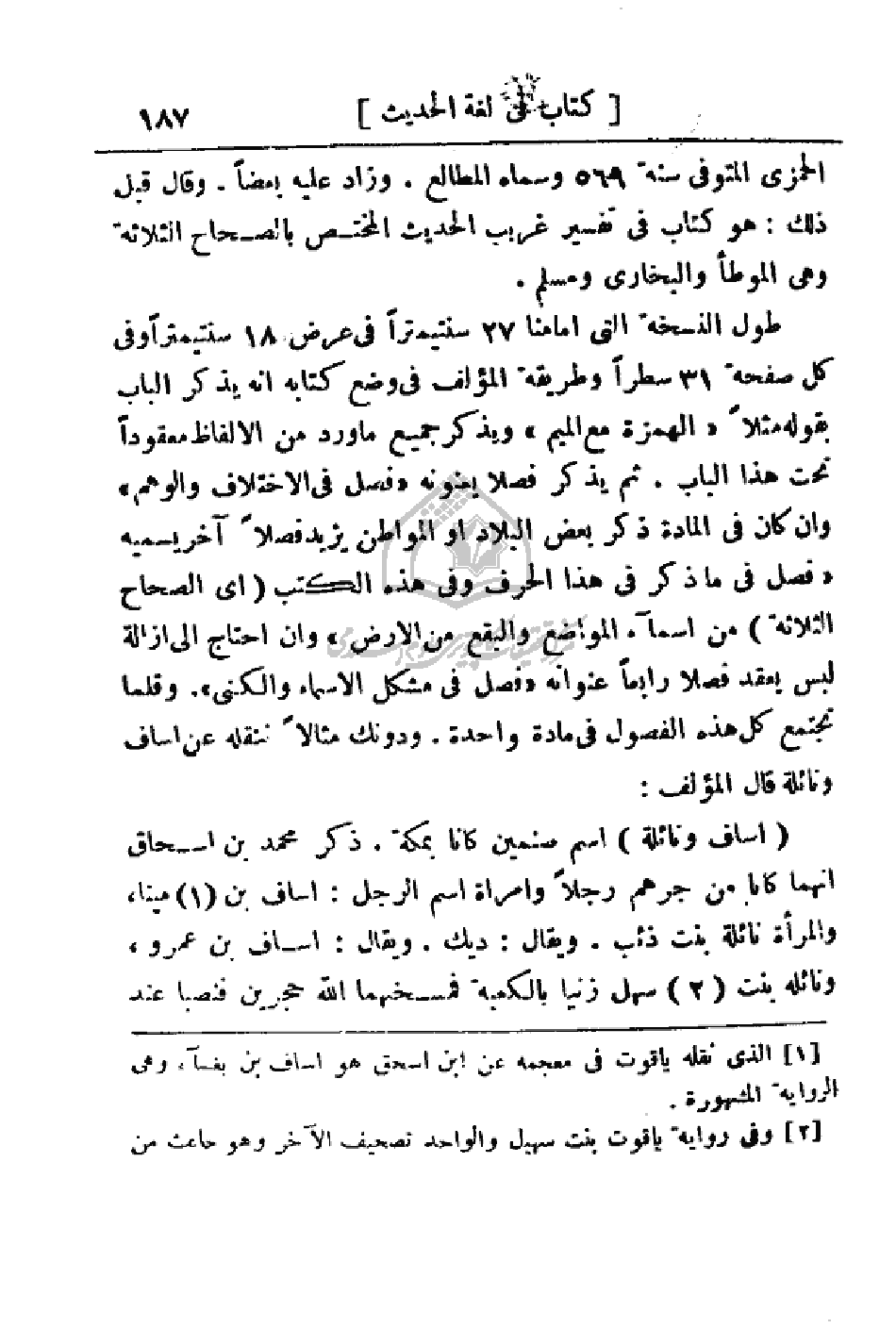 طول النسخة التي أمامنا 27 سنتيمتراً في عرض 18 سنتيمتراً وفي كل صفحة 31 سطراً وطريقة المؤلف في وضع كتابه إنه يذكر الباب بقوله مثلاً (الهمزة مع الميم) ويذكر الجميع ما ورد من الألفاظ معقودا تحت هذا الباب. ثم يذكر فصلا يعنونه (فصل في الاختلاف والوهم) وان كان في المادة ذكر بعض البلاد أو المواطن يزيد فصلا آخر يسميه (فصل في ما ذكر في هذا الحرف وفي هذه الكتب (أي الصحاح الثلاثة) من أسماء المواضع والبقع من الأرض) وان احتاج إلى إزالة ليس يعقد فصلا رابعا عنوانه (فصل في مشكل الأسماء والكنى). وقلما تجتمع كل هذه الفصول في مادة واحدة. ودونك مثالا ننقله عن أسف ونائلة قال المؤلف:
