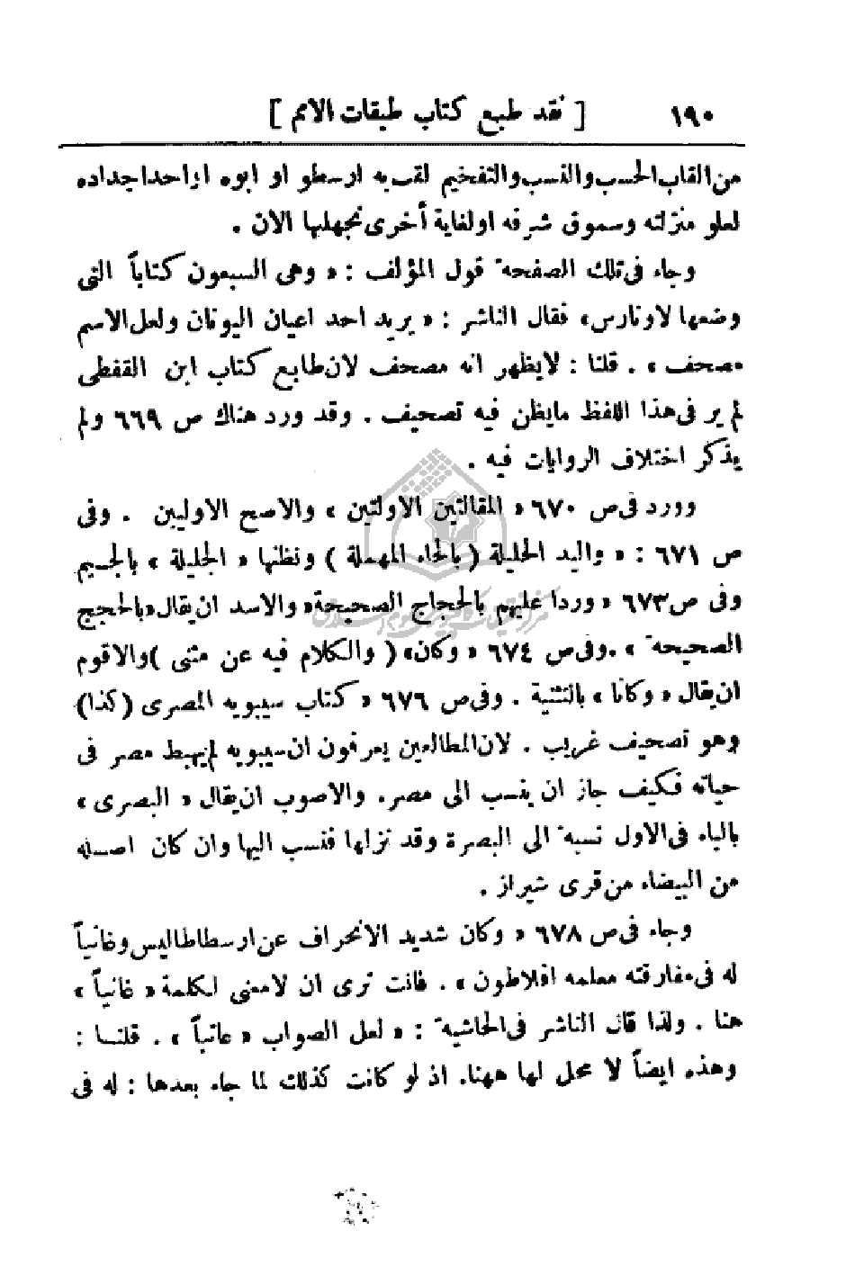 مثنى) والأقوم أن يقال (وكانا) بالتثنية. وفي ص676 (كتاب سيبويه المصري (كذا) وهو تصحيف غريب. لان المطالعين يعرفون أن سيبويه لم يهبط مصر في حياته فكيف جاز أن ينسب إلى مصر. والأصوب أن يقال (المصري) بالباء في الأول نسبة إلى البصرة وقد نزلنا فنسب إليها وان كان اصله من البيضاء من قرى شيراز.