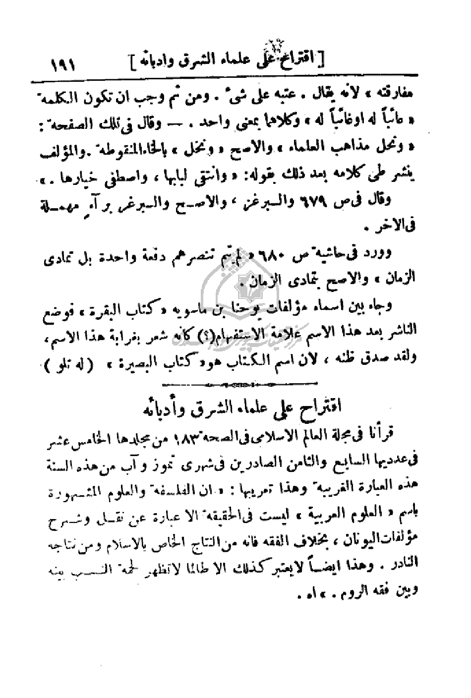 قرأنا في مجلة العالم الإسلامي في الصفحة 183 من مجلدها الخامس عشر في عددها السابع والثامن الصادرين في شهري تموز وآب من هذه السنة هذه العبارة الغريبة وهذا تعريبها: (أن الفلسفة والعلوم المشهورة باسم (العلوم العربية) ليست في الحقيقة إلا عبارة عن نقل وشرح مؤلفات اليونان، وبخلاف الفقه فإنه من النتاج الخاص بالإسلام ومن نتاجه النادر. وهذا أيضاً لا يعتبر كذلك إلا طالما لا تظهر لحمة النسب بينه وبين فقه الروم.) اهـ.