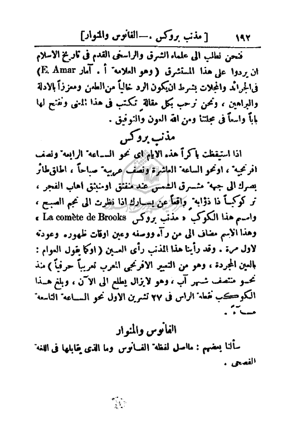 إذا استيقظت باكراً هذه الأيام أي نحو الساعة الرابعة ونصف إفرنجية، أو نحو الساعة العاشرة ونصف عربية صباحاً، أطلق طائر بصرك إلى جهة مشرق الشمس عند منفتق أو منبثق أهاب الفجر، تر كوكباً ذا ذؤابةٍ واقعاً عن يسارك إذا نظرت إلى نجم الصبح، واسم هذا الكوكب (مذنب بروكس وهذا الاسم مضاف إلى من رآه ووصفه وعين أوقات ظهوره وعودته لأول مرة. وقد رأينا هذا المذنب رأى العين (أو كما يقول العوام: بالعين المجردة، وهو من التعبير الإفرنجي المعرب تعريباً حرفياً) منذ نحو منتصف شهر آب، وهو لا يزال يطلع إلى الآن، وبلغ هذا الكوكب نقطة الرأس في 27 تشرين الأول نحو الساعة التاسعة مساء.