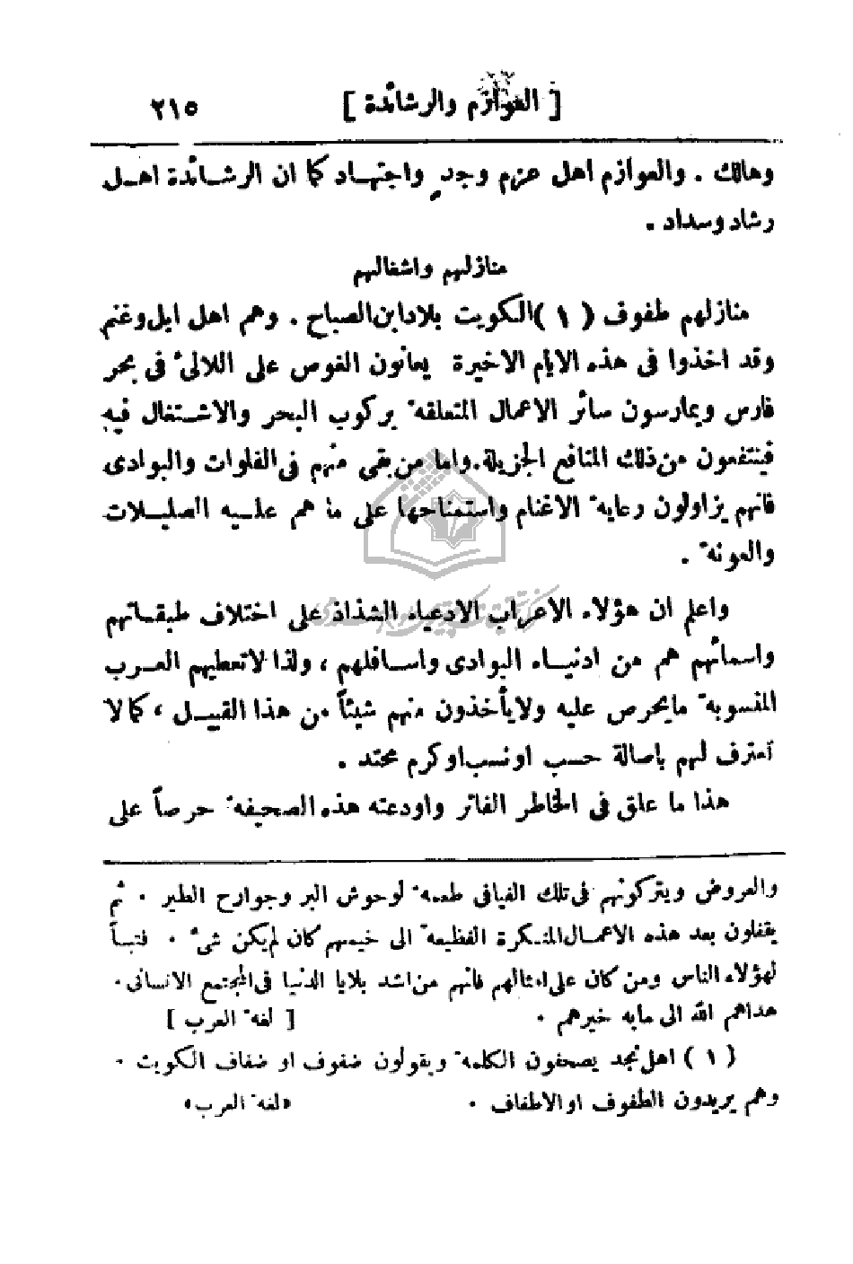 منازلهم طفوف الكويت بلاد ابن الصباح. وهم أهل ابل وغنم وقد اخذوا في هذه الأيام الأخيرة يعانون الغوص على اللآلئ في بحر فارس ويمارسون سائر الأعمال المتعلقة بركوب البحر والاشتغال فيه فينتفعون من ذلك المنافع الجزيلة. وأما من بقي منهم في