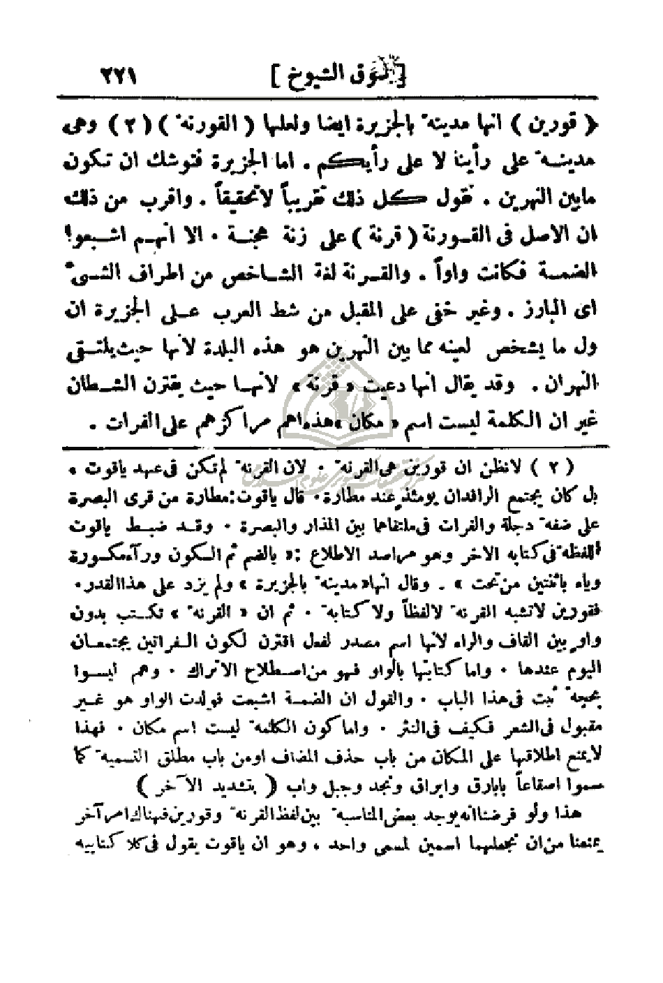 (قورين) إنها مدينة بالجزيرة أيضاً ولعلها (القورنة) وهي مدينة على رأينا لا على رأيكم، أما الجزيرة فتوشك إن تكون ما بين النهرين. نقول كل ذلك تقريباً لا تحقيقاً. واقرب من ذلك إن الأصل في القورنة (قرنة) على زنة هجنة. إلا إنهم اشبعوا الضمة فكانت واوا. والقرنة لغة الشاخص من أطراف الشيء أي البارز. وغير خفي على المقبل من شط العرب عل الجزيرة إن أول ما يشخص لعينيه مما بين النهرين هو هذه البلدة لأنها حيث ملتقى النهران. وقد يقال إنها دعيت (قرنة) لأنها حيث يقترن الشيطان غير إن الكلمة ليست اسم (مكان) هذه أهم مراكزهم على الفرات.