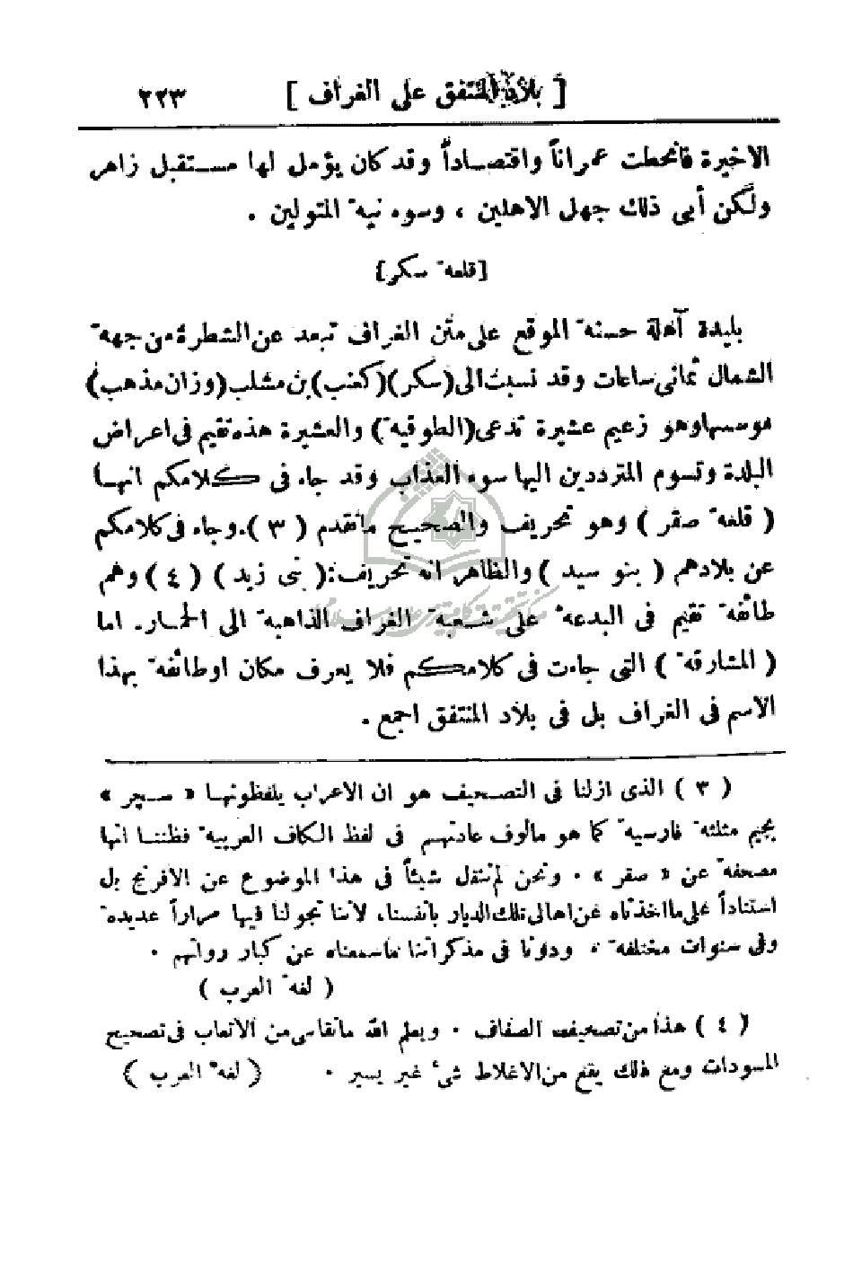 بليدة آهلة حسنة الموقع على متن الغراف تبعد عن الشطرة من جهة الشمال ثماني ساعات وقد نسبت إلى (سكر) (كعنب) بن مشلب (وزان مذهب) مؤسسها وهو زعيم عشيرة تدعى (الطوقية) والعشيرة هذه تقيم في أعراض البلدة وتسوم المترددين إليها سوء العذاب وقد جاء في كلامكم إنها (قلعة صقر) وهو تحريف والصحيح ما تقدم وجاء في كلامكم عن بلادهم (بنو سيد) والظاهر إنه تحريف: (بني زيد) وهم طائفة تقيم في البدعة على شعبة الغراف الذاهبة إلى الحمار. أما (المشارقة) التي جاءت في كلامكم فلا تعرف مكان أو طائفة بهذا الاسم في الغراف بل في بلاد المنتفق اجمع.