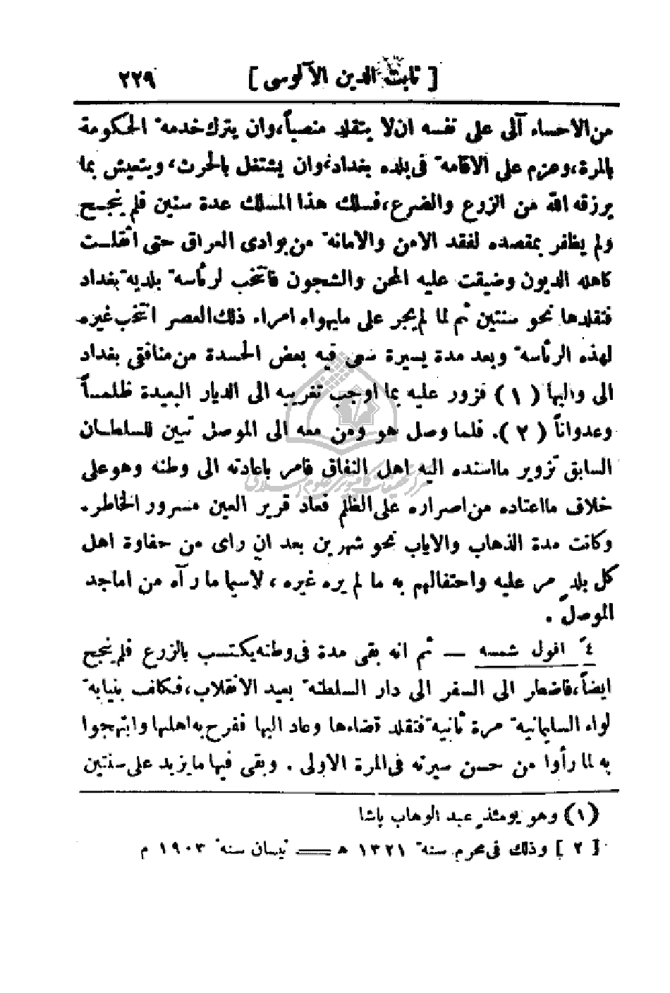 من الإحسان إلى على نفسه أن لا يتقلد منصباً، وإن يترك خدمة الحكومة بالمرة، وعزم على الإقامة في بلده بغداد، وإن يشتغل بالحرث، ويتعيش بما يرزقه الله من الزرع والضرع، فسلك هذا المسلك عدة سنيين فلم ينجح ولم يظفر بمقصده لفقد الأمن والأمانة من بوادي العراق حتى أثقلت كاهله الديون وضيقت عليه المحن والشجون فأنتخب لرئاسة بلدية بغداد فتقلدها نحو سنتين ثم لما لم يجر على ما يهواه أمراء ذلك العصر أنتخب غيره لهذه الرئاسة وبعد مدة يسيرة سعى فيه بعض الحسدة من منافقي بغداد إلى واليها فزور عليه بما أوجب تغريبه إلى الديار البعيدة ظلما وعدواناً. فلما وصل هو ومن معه إلى الموصل تبين للسلطان السابق تزوير ما اسنده إليه أهل النفاق فأمر بإعادته إلى وطنه وهو على خلاف ما إعتاده من إصراره على الظلم فعاد قرير العين مسرور الخاطر. وكانت مدة الذهاب والإياب نحو مدة شهرين بعد إن رأى من حفاوة أهل كل بلد مر عليه واحتفالهم به ما لم يره غيره، لا سيما ما رآه من اماجد الموصل.