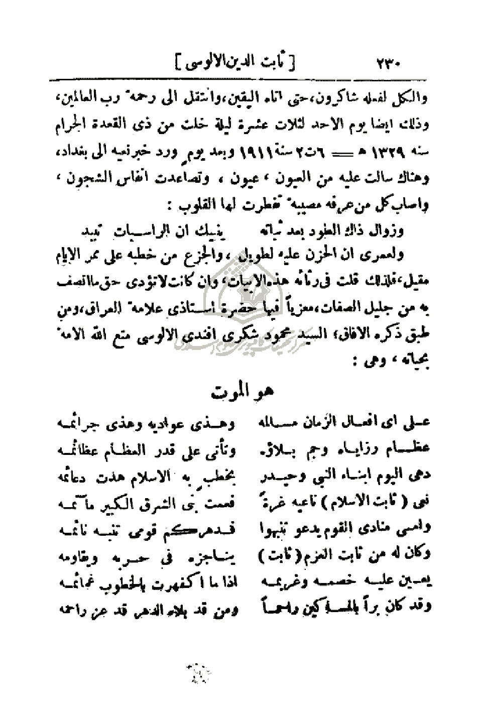 ولعمري إن الحزن عليه لطويل، والجزع من خطبه على ممر الأيام مقيل، فلذلك قلت في رثائه هذه الأبيات، وإن كانت لا تؤدي حق ما اتصف به من جليل الصفات، معزياً فيها حضرة أستاذي علامة العراق، ومن طبق ذكره الافاق، السيد محمود شكري أفندي الالوسي متع الله الأمة بحياته، وهي: