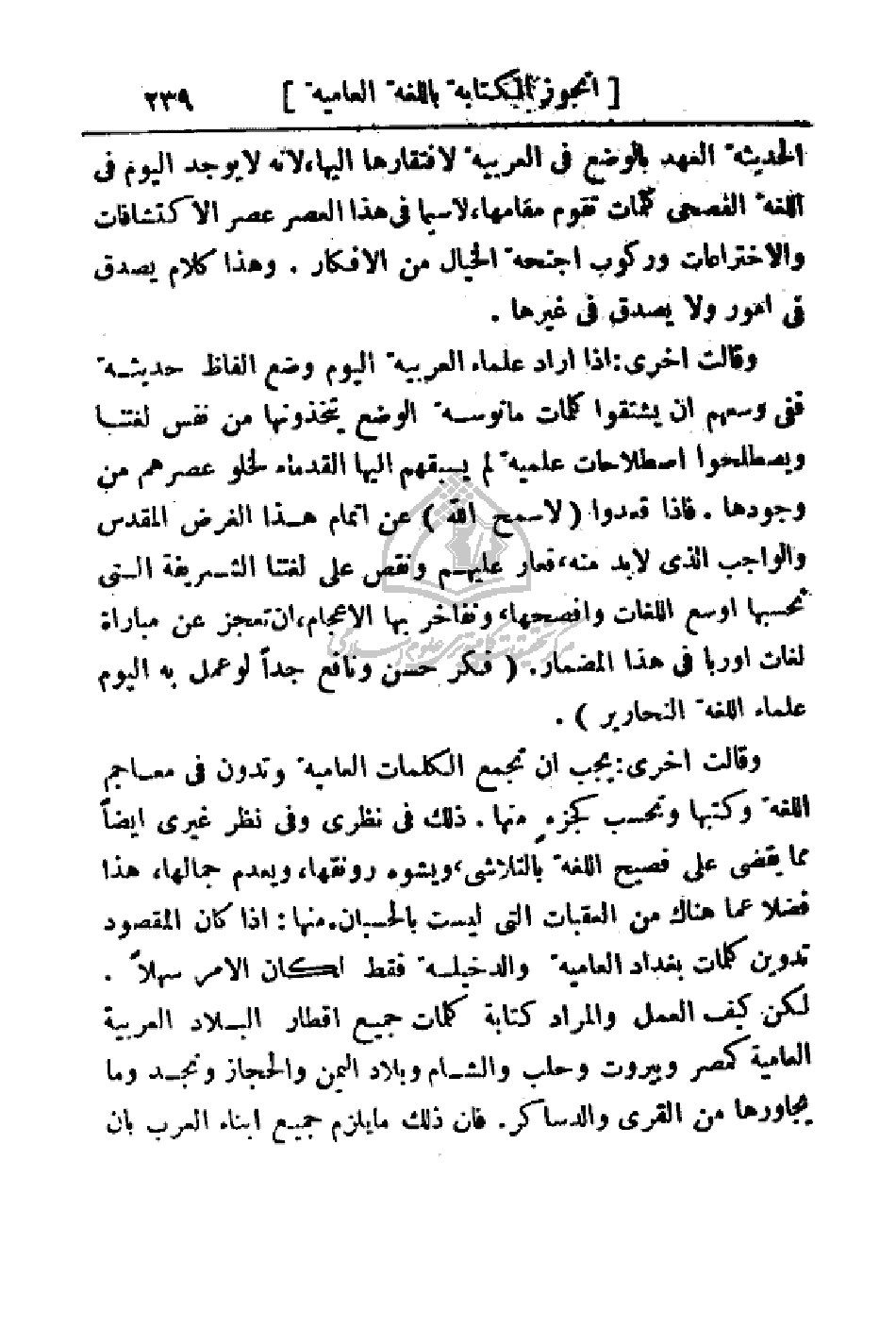 وقالت أخرى: إذا أراد علماء العربية اليوم وضع ألفاظ حديثة ففي وسعهم إن يشتقوا كلمات مأنوسة الوضع يتخذونها من نفس لغتنا ويصطلحوا اصطلاحات علمية لم يسبقهم إليها القدماء لخلو عصرهم من وجودها. فإذا قعدوا (لا سمح الله) عن إتمام هذا الغرض المقدس والواجب الذي لابد منه، فعار عليهم ونقص على لغتنا الشريفة التي نحسبها أوسع اللغات وأفصحها، ونفاخر بها الاعاجم، إن تعجز عن مباراة لغات أوربا في هذا المضمار. (فكر حسن ونافع جدا لو عمل به اليوم علماء اللغة النحارير).