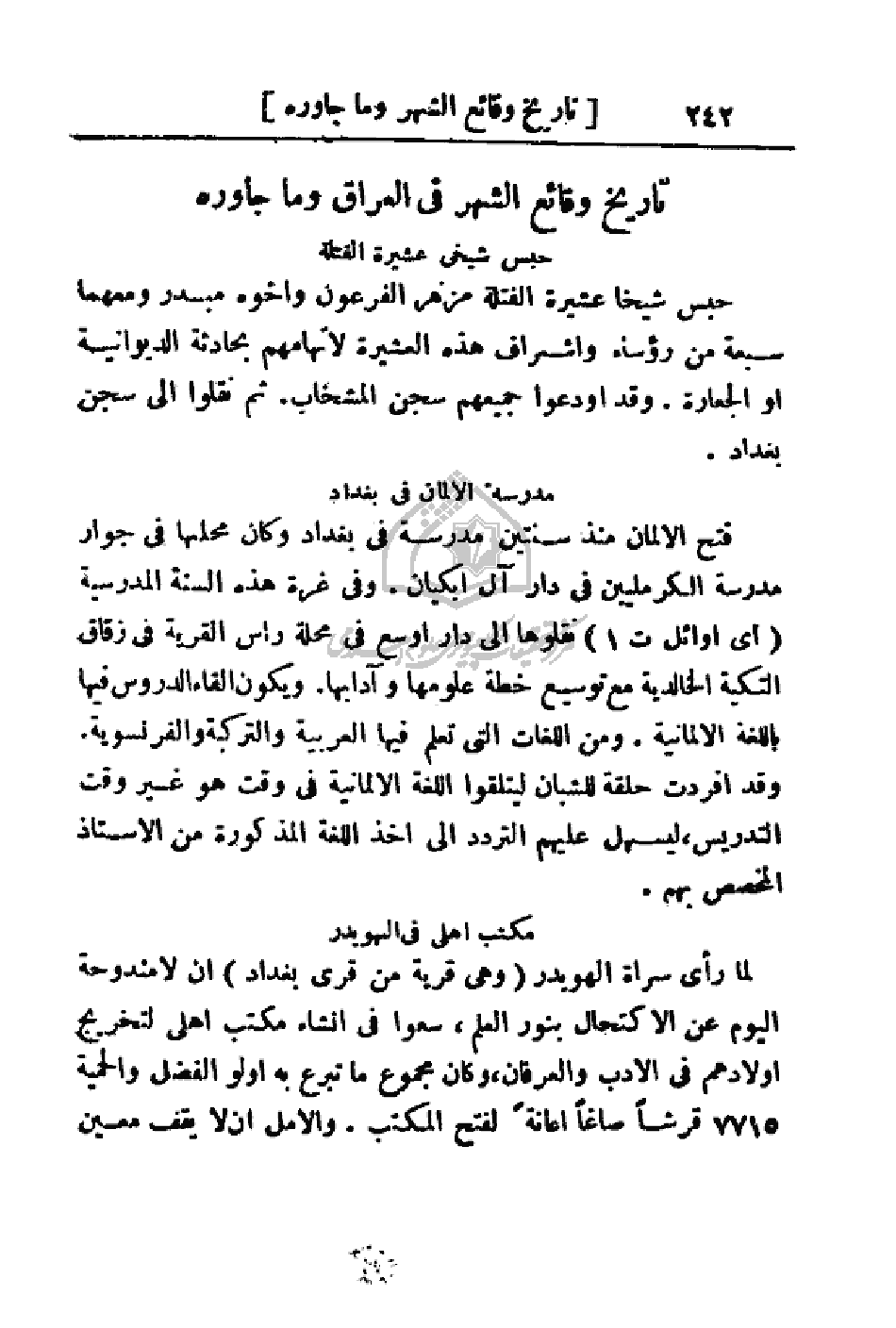 فتح الألمان منذ سنتين مدرسة في بغداد وكان محلها بجوار مدرسة الكرملين في دار آل ابكيان. وفي غرة هذه السنة المدرسية (أي أوائل ت1) نقلوها إلى دار أوسع في محلة رأس القرية في زقاق التكية الخالدية مع توسيع خطة علومها وآدابها. ويكون إلقاء الدروس فيها باللغة الألمانية. ومن اللغات التي تعلم بها العربية والتركية والفرنسية. وقد أفردت حلقة للشبان ليتلقوا اللغة الألمانية في وقت هو غير وقت التدريس، ليسهل عليهم التردد إلى اخذ اللغة المذكورة من الأستاذ المخصص بهم.