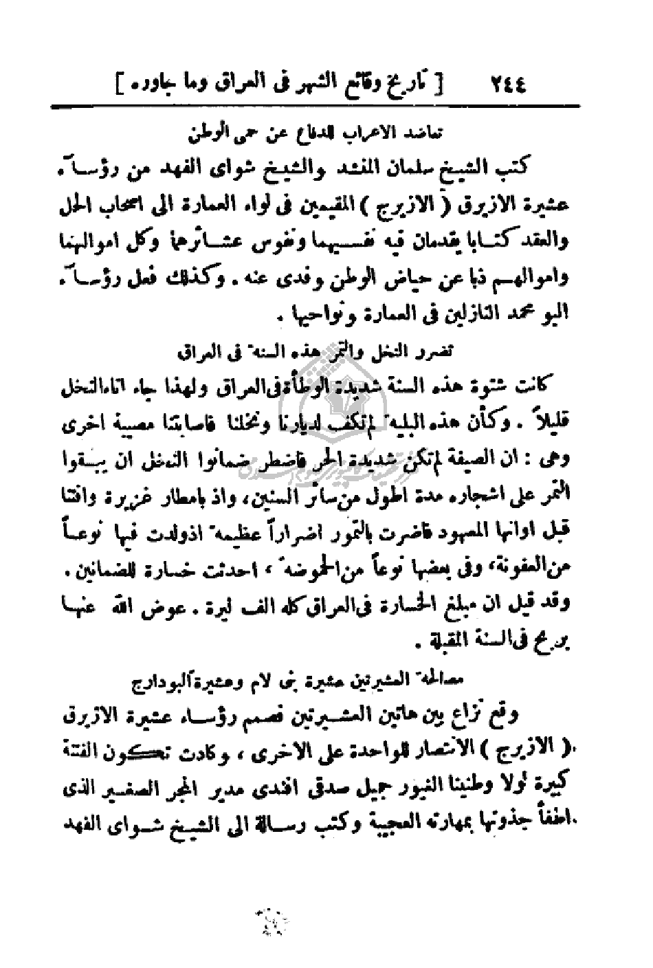 كانت شتوة هذه السنة شديدة الوطأة في العراق ولهذا جاء إناء النخل قليلاً. وكان هذه البلية لم تكف لديارنا ونخلنا فأصابتنا مصيبة أخرى وهي: إن الصيفة لم تكن شديدة الحر فاضطر ضمانوا النخل إن يبقوا التمر على أشجاره مدة أطول من سائر السنين، وإذ بأمطار غزيرة وافتنا قبل أوانها من العفونة، وفي بعضها نوعاً من الحموضة، أحدثت خسارة للضمانين. وقد قيل إن مبلغ الخسارة في العراق كله ألف ليرة. عوض الله عنها بربح في السنة المقبلة.