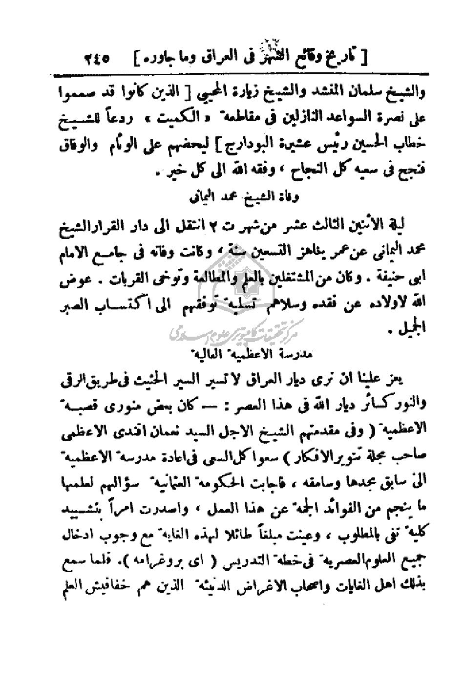 يعز علينا إن نرى ديار العراق لا تسير السير الحثيث في طريق الرقى والنور كسائر ديار الله في هذا العصر: - كان بعض منوري قصبة الاعظمية (وفي مقدمتهم الشيخ الأجل السيد نعمان أفندي الاعظمي صاحب مجلة تنوير الأفكار) سعوا كل السعي في إعادة مدرسة الاعظمية إلى سابق مجدها وسامقه، فأجابت الحكومة العثمانية سؤالهم لعلمها ما ينجم من الفوائد الجمة عن هذا العمل، وأصدرت أمراً بتشييد كلية تفي بالمطلوب، وعينت مبلغاً طائلا لهذه الغاية مع وجوب إدخال جميع العلوم العصرية في خطة التدريس (أي بروغرامه). فلما سمع بذلك أهل الغايات وأصحاب الأغراض الدنيئة الذين هم خفافيش العلم