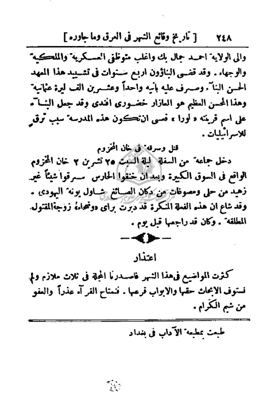 دخل جماعة من السفلة ليلة السبت 25 تشرين 2 خان المخزوم الواقع في السوق الكبيرة وبعد أن خنقوا الحارس سرقوا شيئاً غير زهيد من حلى ومصوغات من دكان الصائغ شاول يونة اليهودي. وقد شاع أن هذه الفعلة المنكرة قد دبرت برأي (وضحاء) زوجة المقتول المطلقة. وكان قد راجعها قبل يوم.