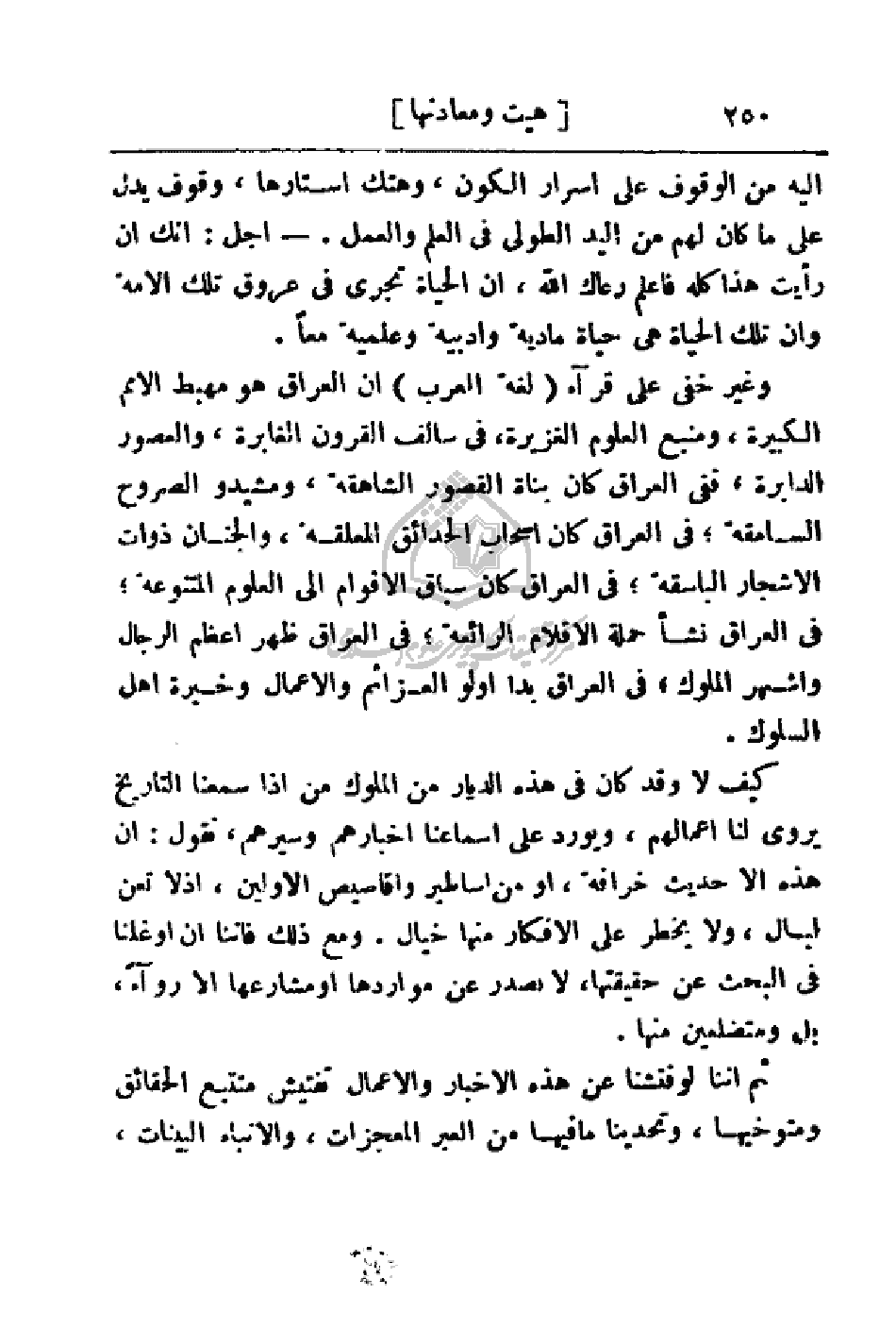 وغير خفي على قراء (لغة العرب) أن العراق هو مهبط الأمم الكبيرة، ومنبع العلوم الغزيرة، في سالف القرون الغابرة، والعصور الدابرة، ففي العراق كان بناة القصور الشاهقة، ومشيدو الصروح السامقة؛ في العراق كان أصحاب الحدائق المعلقة، والجنان ذوات الأشجار الباسقة؛ في العراق كان سباق الأقوام إلى العلوم المتنوعة؛ في العراق نشأ حملة الأقلام الرائعة؛ في العراق ظهر اعظم الرجال وأشهر الملوك؛ في العراق بدا أولوا العزائم والأعمال وخيرة أهل السلوك.