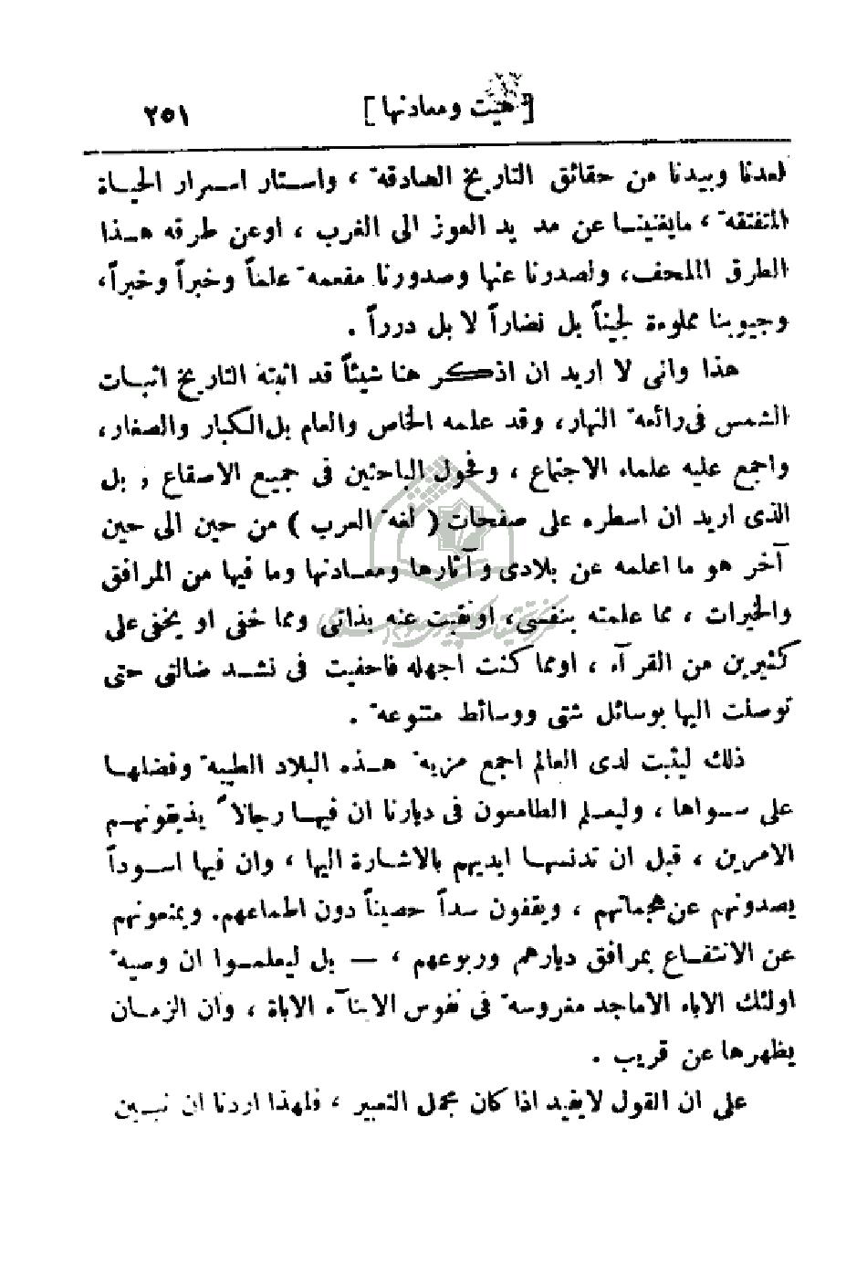 هذا وأني لا أريد أن اذكر هنا شيئاً قد أثبته التاريخ إثبات الشمس في رائعة النهار، وقد علمه الخاص والعام بل الكبار والصغار، واجمع عليه علماء الاجتماع، وفحول الباحثين في جميع الاصقاع، بل الذي أريد أن اسطره على صفحات (لغة العرب) من حين إلى حين آخر هو ما اعلمه عن بلادي وآثارها ومعادنها وما فيها من المرافق والخيرات، مما علمته بنفسي، أو نقبت عنه بذاتي ومما خفي أو يخفى على كثيرين من القراء، أو مما كنت أجهله فأحفيت في نشد ضالتي حتى توصلت إليها بوسائل شتى ووسائط متنوعة.