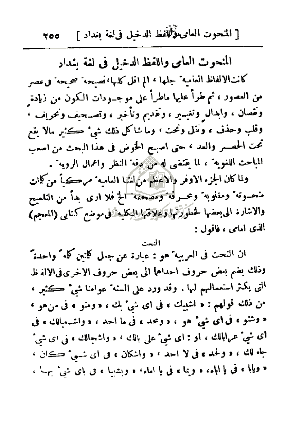 ولما كان الجزء الأوفر والأعظم من لغتنا العامية مركباً من كلمات منحوتة ومقلوبة ومحرفة ومصحفة الخ فلا أرى بداً من التلميح والإشارة إلى بعضها لخطورتها وعلاقتها الكلية في موضع كتابي (المعجم) الذي امامي، فاقول: