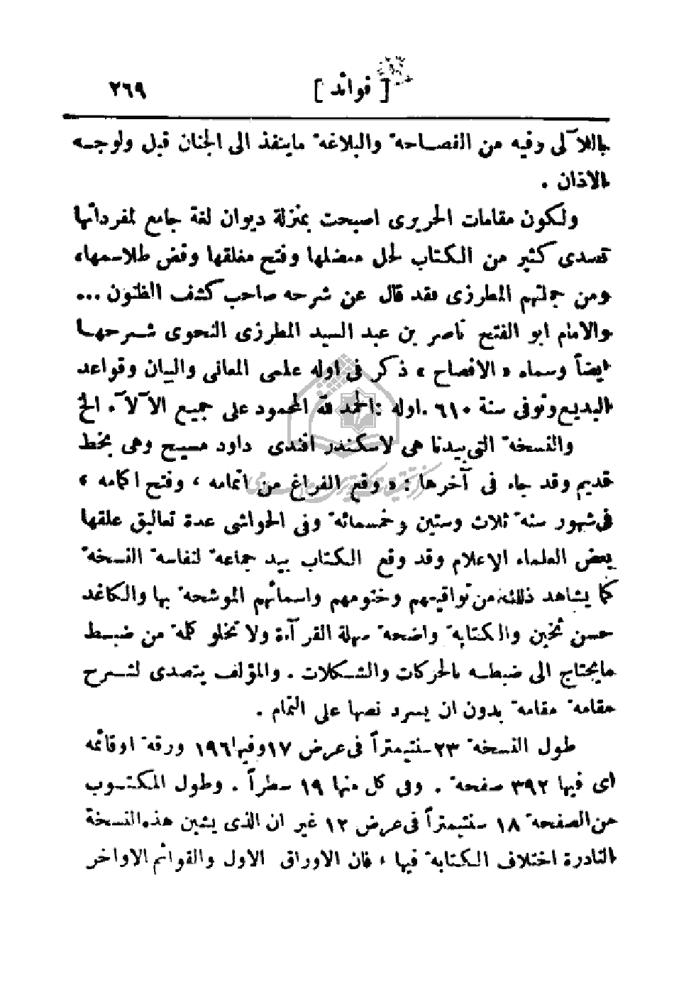 باللآلئ وفيه من الفصاحة والبلاغة ما ينفذ إلى الجنان قبل ولوجه الأذان. ولكون مقامات الحريري أصبحت بمنزلة ديوان لغة جامع لمفرداتها تصدى كثير من الكتاب لحل معضلها وفتح مغلقها وفض طلاسمها، ومن جملتهم المطرزي فقد قال عن شرحه صاحب كشف الظنون. . . والإمام أبو الفتح ناصر بن عبد السيد المطرزي النحوي شرحها أيضاً وسماء (الإفصاح) ذكر في أوله علمي المعاني والبيان وقواعد البديع