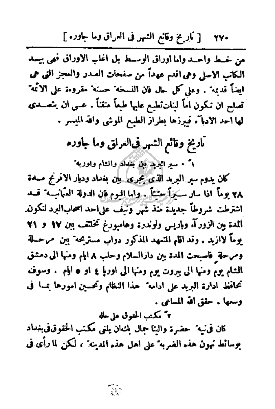 كان يدوم سير البريد الذي يجري بين بغداد وديار الإفرنج مدة 28 يوماً إذا سار سيراً حثيثاً. وأما اليوم فان الدولة العثمانية قد اشترطت شروطا جديدة منذ شهر ونيف على أحد أصحاب البرد لتكون المدة بين الزوراء وباريس ولوندرة وهامبورغ تختلف بين 17 و21 يوما لا أزيد. وقد أقام المتعهد المذكور دواب مستريحة بين مرحلة ومرحلة فأصبحت المدة بين دار السلام وحلب 8 أيام ومنها إلى دمشق الشام يوم ومنها إلى بيروت يوم ومنها إلى أوربا 4 أو 5 أيام. وسوف تحافظ إدارة البريد على إدامة هذا النظام وتحسين أمورها بما في وسعها. حقق الله المساعي.
