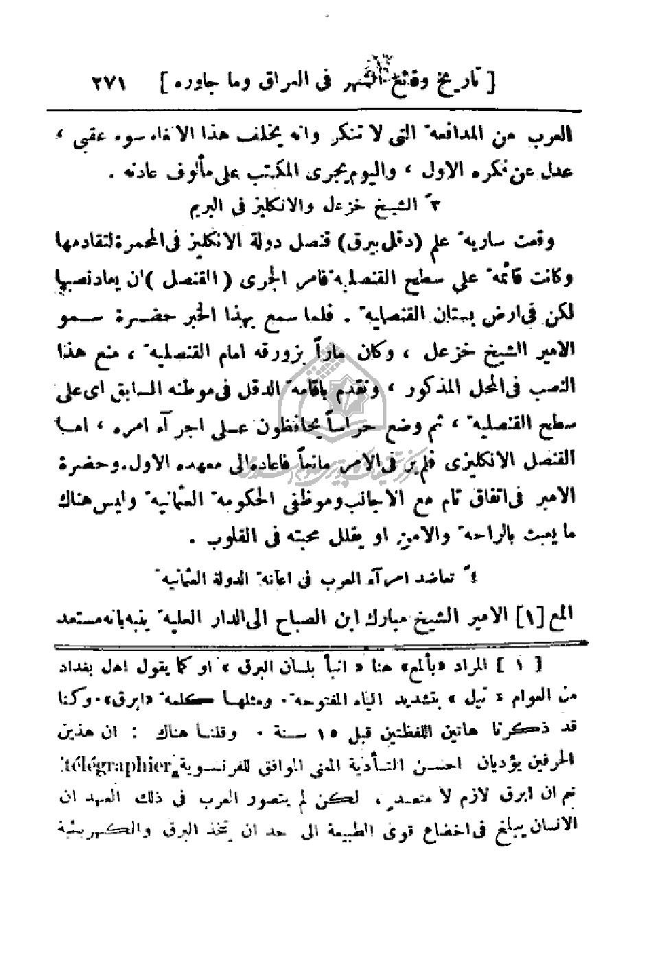 وقعت سارية علم (دقل بيرق) قنصل دولة الإنكليز في المحمرة لتقادمها وكانت قائمة على سطح القنصلية فأمر الجري (القنصل) أن يعاد نصبها لكن في أرض بستان القنصلية. فلما سمع بهذا الأمر حضرة سمو الأمير الشيخ خزعل، وكان ماراً بزورقه أمام القنصلية، منع هذا النصب في المحل المذكور، ونقدم بإقامة الدقل في موطنه السابق أي على سطح القنصلية، ثم وضع حراساً يحافظون على إجراء امره، اما القنصل الإنكليزي فلم ير في الأمر مانعا فأعاده إلى معهده الأول. وحضرة الأمير في اتفاق تام مع الأجانب وموظفي الحكومة العثمانية وليس هناك ما يعبث بالراحة والأمن أو يقلل محبته في القلوب.