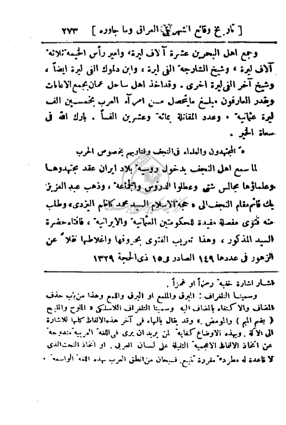 لما سمع أهل النجف بدخول روسية بلاد إيران عقد مجتهدوها وعلماؤها مجالس شتى وعطلوا الدروس والجماعة، وذهب عبد العزيز بك قائم مقام النجف إلى (حجة الإسلام السيد محمد كاظم اليزدي) وطلب منه فتوى مفصلة مفيدة للحكومتين العثمانية والايرانية، فافتاه حضرة السيد المذكور، وهذا تعريب الفتوى بحروفها وأغلاطها نقلاً عن الزهور في عددها 149 الصادر في 15 ذي الحجة 1329