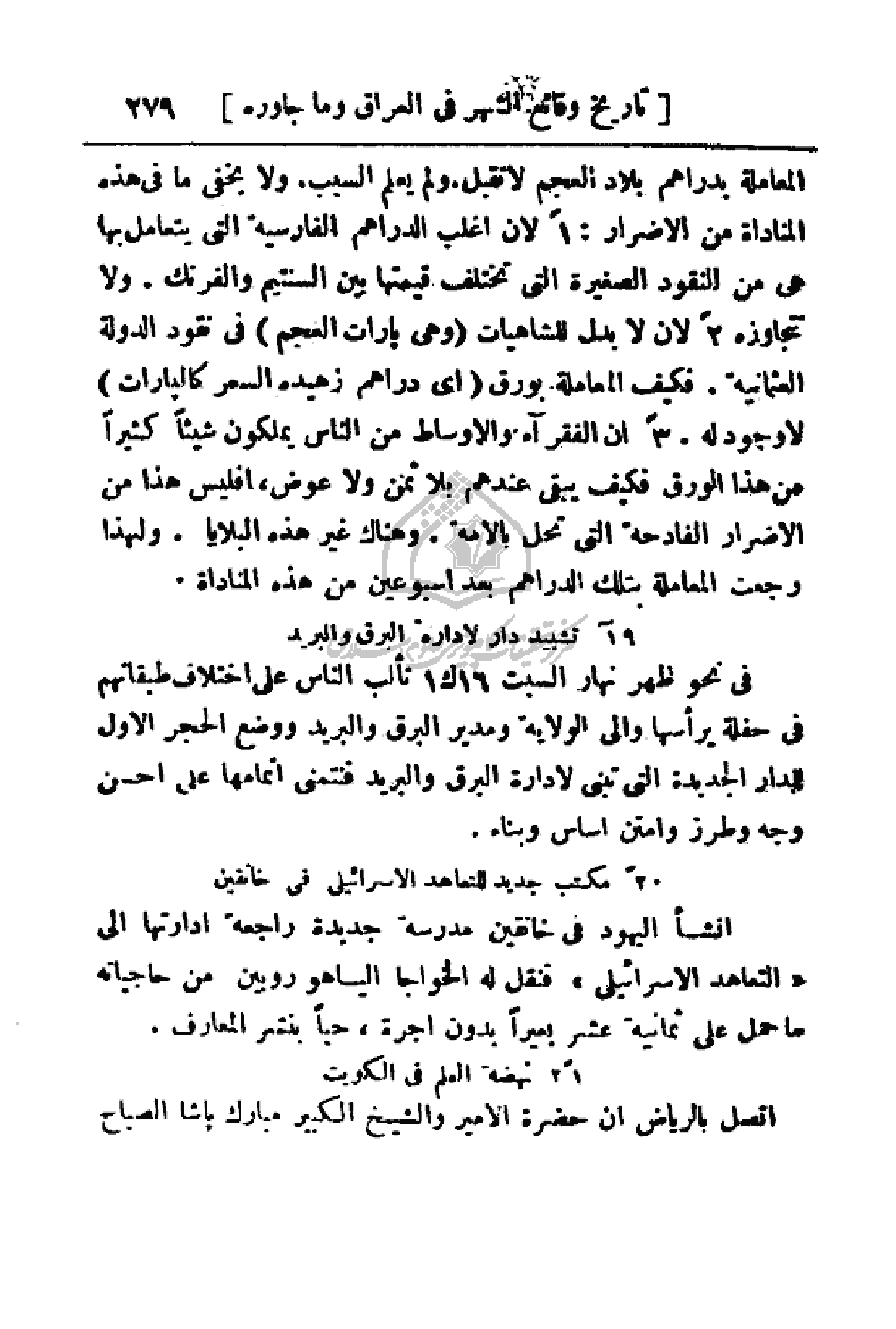 المعاملة بدراهم بلاد العجم لا تقبل. ولم يعلم السبب. ولا يخفى ما في هذه المناداة من الأضرار: 1 لان اغلب الدراهم الفارسية التي يتعامل بها هي من النقود الصغيرة التي تختلف قيمتها بين السنتيم والفرنك. ولا تتجاوزه 2ً لان بدل للشاهيات (وهي بارات العجم) في نقود الدولة العثمانية. فكيف المعاملة بالورق (أي دراهم زهيدة السعر كالبارات) لاوجود له. 3ً إن الفقراء والأوساط من الناس يملكون شيئاً كثيراً من هذا الورق فكيف يبقى عندهم بلا ثمن ولاعوض، افليس من هذا الأضرار الفادحة التي تحل بالأمة. وهناك من هذه البلايا. ولهذا رجعت المعاملة بتلك الدراهم بعد أسبوعين من هذه المناداة.