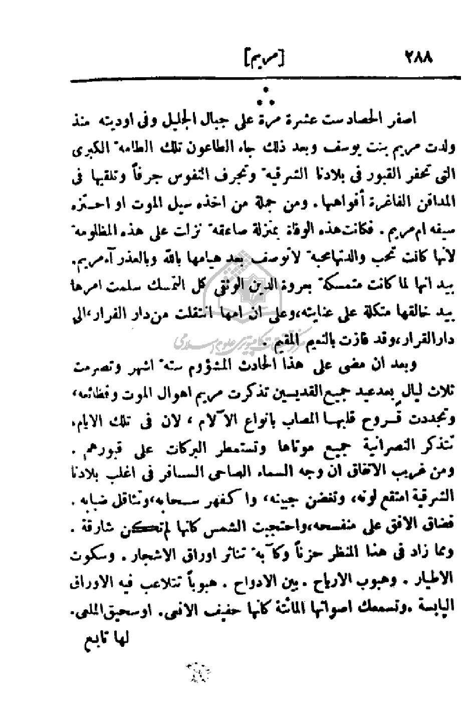 أصفر الحصاد ست عشرة مرة على جبال الجليل وفي أوديته منذ ولدت مريم بنت يوسف وبعد ذلك جاء الطاعون تلك الطلعة الكبرى التي تحفر القبور في بلادنا الشرقية وتجرف النفوس جرفاً وتلقيها في المدافن الفاغرة أفواهها. ومن جملة من أخذه سيل الموت أو إحتزه سيفه أم مريم. فكانت هذه الوفاة بمنزلة صاعقة نزلت على هذه المظلومة لأنها كانت تحب