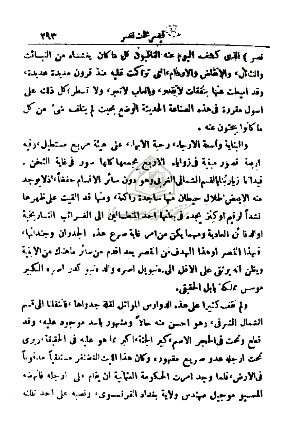 قصر) الذي كشف اليوم عنه الناقبون كل ما كان يغشاه من النبائث والنثائل، والأنقاض والاردام، التي تراكمت عليه منذ قرون مديدة عديدة، وقد أميطت عنها بنفقات لاتقدر، وباتعاب لاتعبر، ولاتسطر؛ كل ذلك على أصول مقررة في هذه الصناعة الحديثة الوضع بحيث لو يتلف شيء من كل ما كانوا يبحثون عنه.