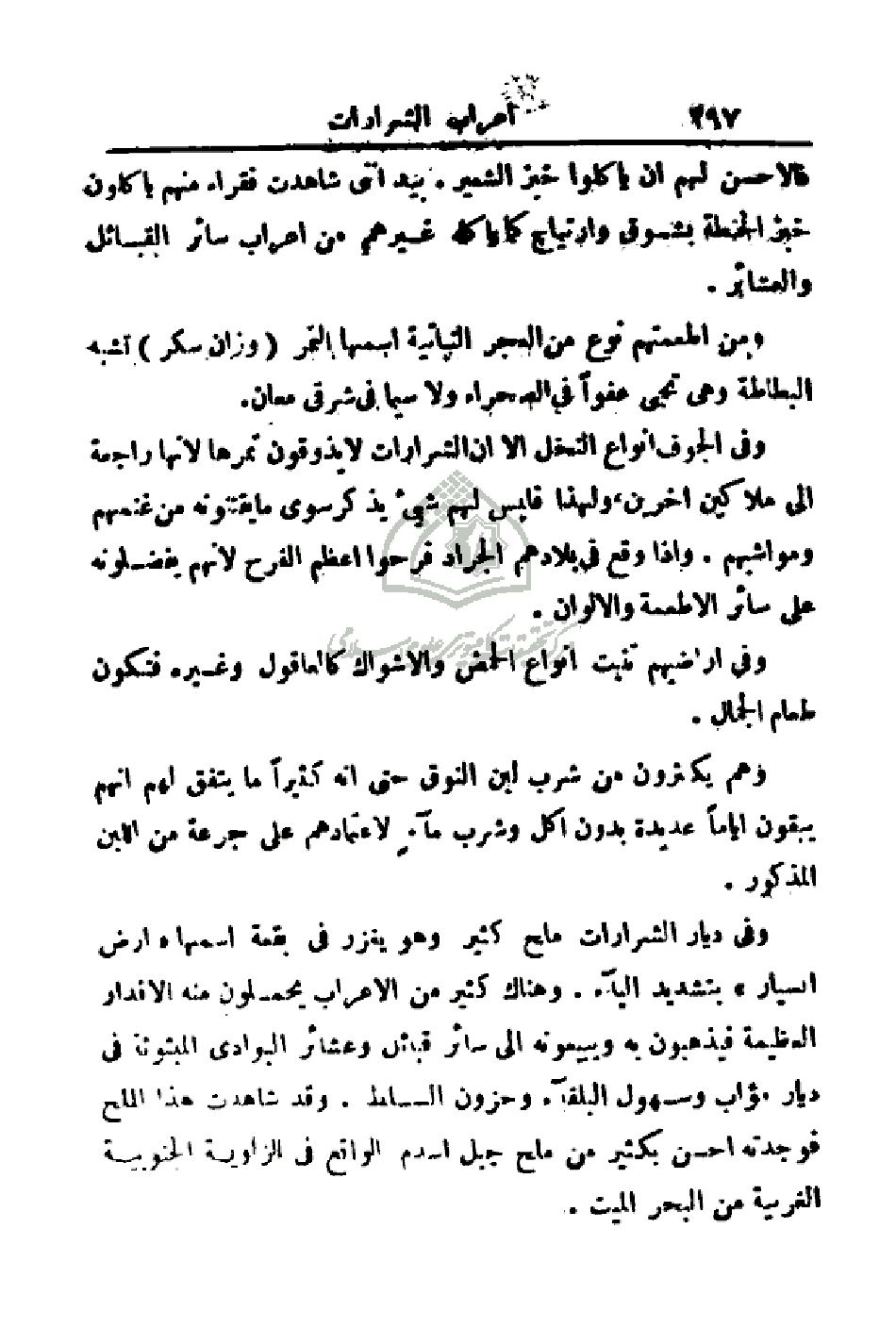 فالأحسن لهم أن يأكلوا خبز الشعير. بيد أنني شاهدت فقراء منهم يأكلون خبز الحنطة بشوق وارتياح كما يأكله غيرهم من أعراب سائر القبائل والعشائر.