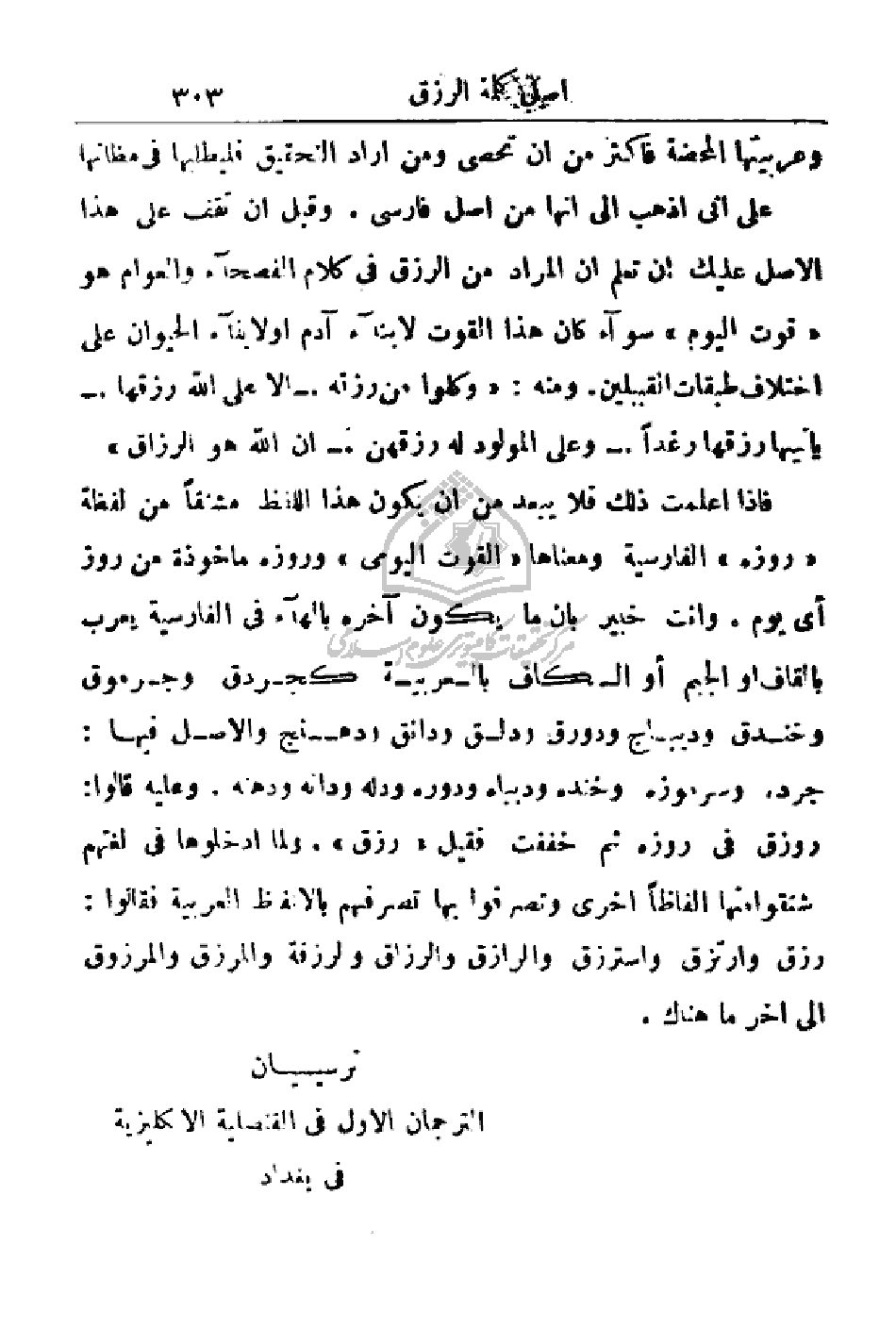 على إني اذهب إلى أنها من اصل فارسي. وقبل أن تقف على هذا الأصل عليك أن تعلم أن المراد من الرزق في كلام الفصحاء والعوام هو (قوت اليوم) سواء كان هذا القوت لأبناء آدم أو لأبناء الحيوان على اختلاف طبقات القبليين. ومنه: (وكلوا من رزقه - إلا على الله رزقها - يأتيها رزقها رغداً - وعلى المولود له رزقهن - أن الله هو الرزاق)