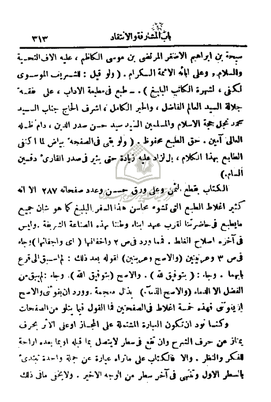صبحة ابن إبراهيم الأصغر المرتضى بن موسى الكاظم، عليه آلاف التحية والسلام، وعلى آبائه الأئمة الكرام. (ولو قيل: للشريف الموسوي لكفى، لشهرة الكاتب البليغ). - طبع في مطبعة الآداب، على نفقة جلالة السيد العالم الفاضل، والحبر الكامل، اشرف الحاج جناب السيد محمد نجل حجة الإسلام والمسلمين السيد سيد حسن صدر الدين، دام ظله العالي آمين. حق الطبع محفوظ. (ولو بقي في الصفحة بياض لما اكتفى الطابع بهذا الكلام، بل لزاد عليه حتى يثير في صدر القارئ دفين السام.)
