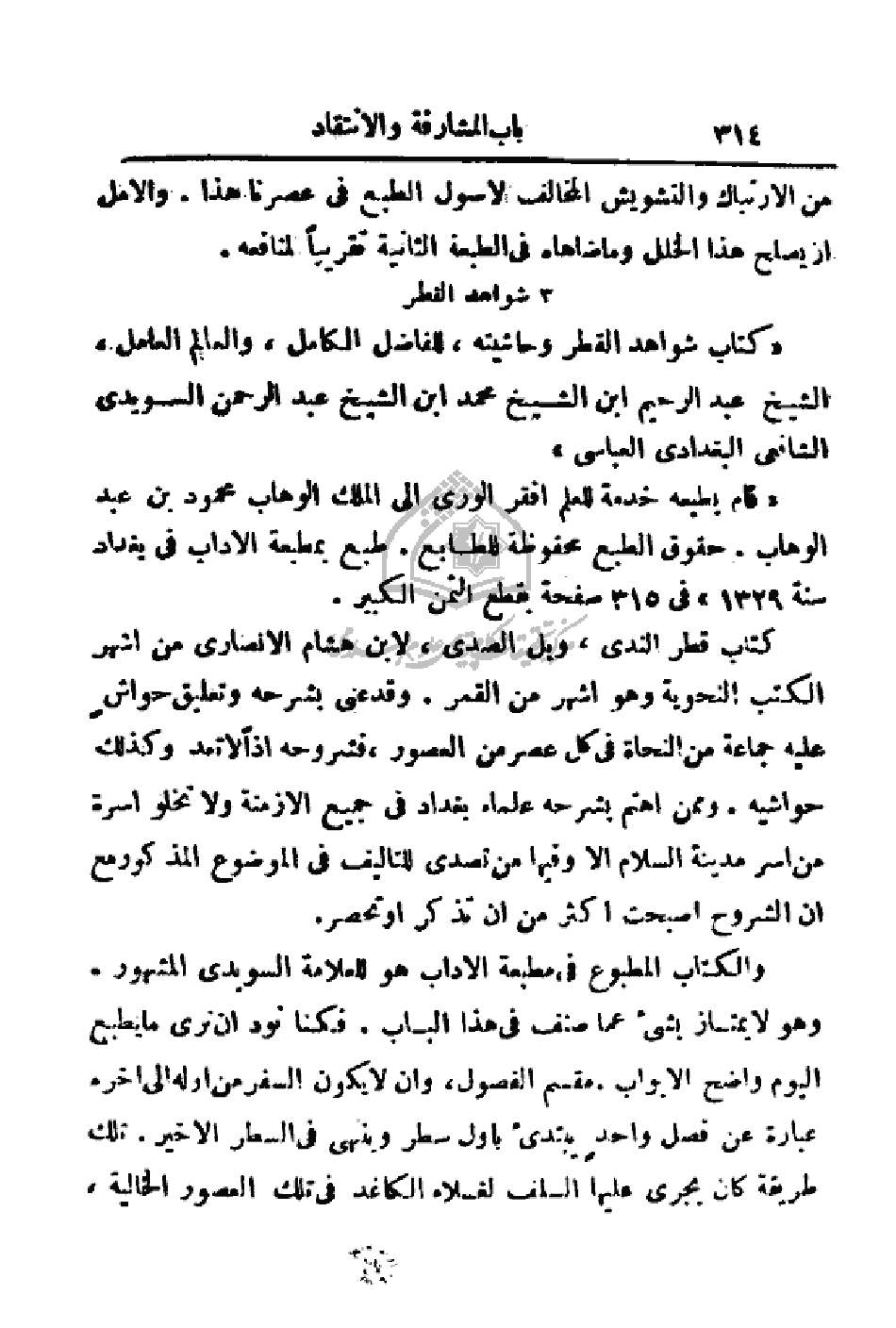 كتاب قطر الندى، وبل الصدى، لابن هشام الأنصاري من اشهر الكتب النحوية وهو اشهر من القمر. وقد عني بشرحه وتعليق حواشٍ عليه جماعة من النحاة في كل عصر من العصور، فشروحه إذا لا تعد وكذلك حواشيه. وممن اهتم بشرحه علماء بغداد في جميع الأزمنة ولا تخلو أسرة من اسر مدينة السلام إلا وفيها من تصدى للتأليف في الموضوع المذكور مع أن الشروح أصبحت اكثر من أن تذكر أو تحصر.