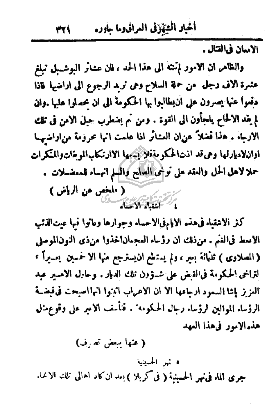 كثر الأشقياء في هذه الأيام في الاحساء وجوارها وعاثوا فيها عيث الذئب الامعط في الغنم. من ذلك أن رؤساء العجمان اخذوا من ذي النون الموصلي (المصلاوي) ثلاثمائة بعير، ولم يستطع أن يسترجع منها إلا خمسين بعيراً، لتراخي الحكومة في القبض على شؤون تلك الديار. وحاول الأمير عبد العزيز باشا السعود إرجاعها إلا أن الأعراب اثبتوا إنها أصبحت في قبضة الرؤساء رجال الحكومة. فتأسف الأمير على وقوع مثل هذه الأمور في هذا العهد.