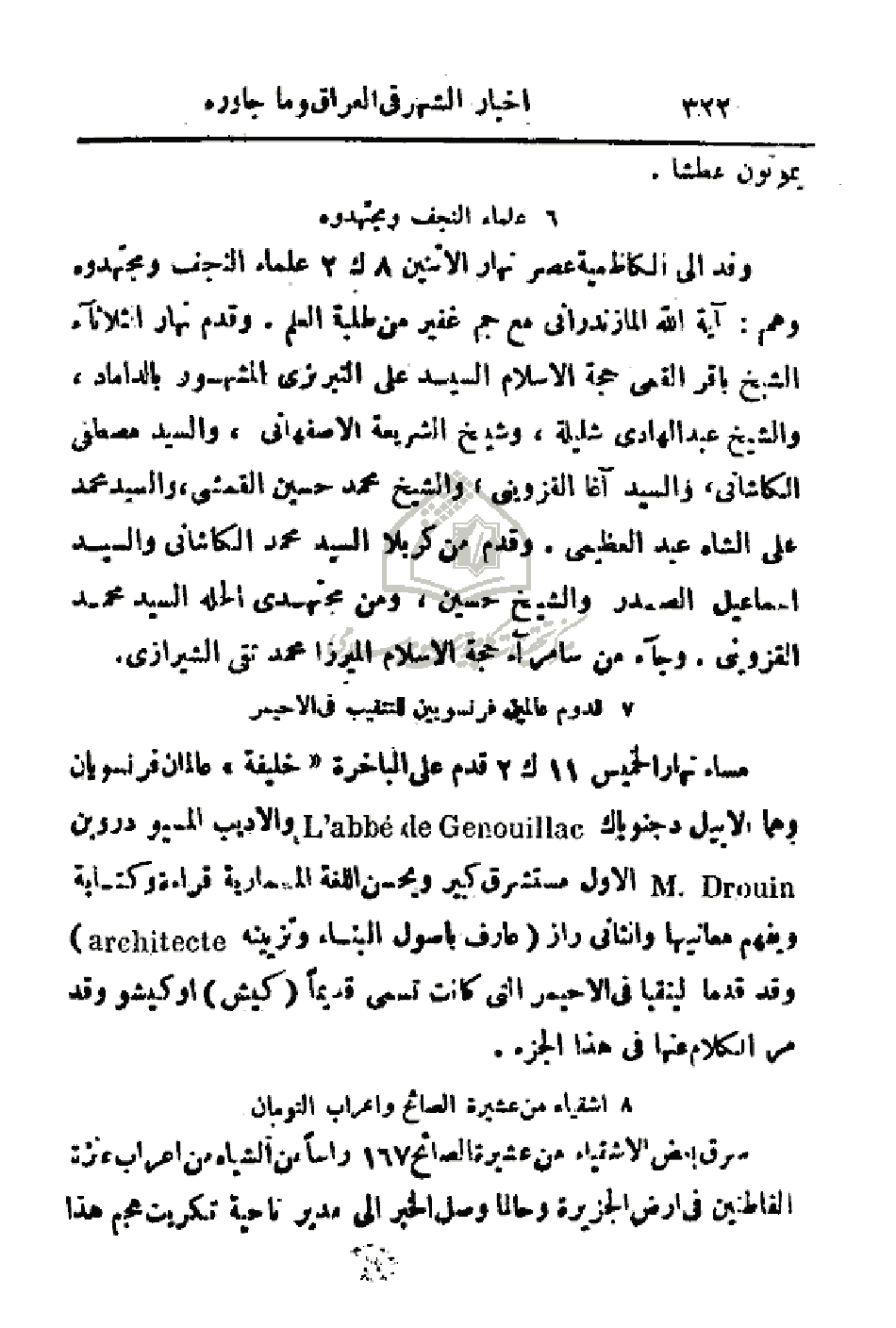 مساء نهار الخميس 11ك2 قدم على الباخرة (خليفة) عالمان فرنسويان وهما الابيل دجنوياك والأديب المسيو دروين الاول مستشرق كبير ويحسن اللغة المسمارية قراءة وكتابة ويفهم معانيها والثاني راز (عارف بأصول البناء وتزينه وقد قدما لينقبا في الاحيمر التي كانت تسمى قديماً (كيش) اوكيشو وقد مر الكلام عنها في هذا الجزء.