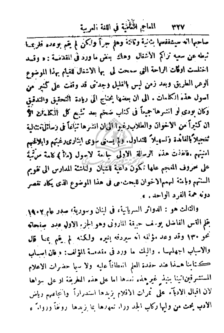 صاحبها انه سيشففعها بثانية وثالثة وهلم جراً ولكن لم يقم بوعده فلربما ثبطه عن سعيه تراكم الأشغال وهاك بعض ما ورد في المقدمة: (وقد اختلست أوقات الراح التي سمحت بها الأشغال للقيام بهذا الموضوع الوعر الطريق وبعد زمن ليس بالقليل وجدتني قد وقفت على كثير من أصول هذه الكلمات. إلى أن بعضها يحتاج إلى زيادة التحقيق والتدقيق كان بودي لو انشرها جميعاً في كتاب ضخم بعد تتبع كل الكلمات إلا أن كثير من الأخوان والطلاب رغبوا إلى أن انشرها تباعا في رسائل متتالية تعجيلاً بالفائدة وتسهيلاً للتداول. ولم يسعني سوى إيثاري رغبتهم وإبلاغهم أمنيتهم، فأنفذت هذه الرسالة الأولى في جامعة لأصول (مائة) كلمة مرتبة على حروف المعجم علها تكون داعية للشبان ولناشئة المدارس إلى تقويم ألسنتهم وباعثة لهمهم الأخوان للبحث معي في هذا الموضوع الذي يكاد تقصر دونه همة الفرد الواحد.)