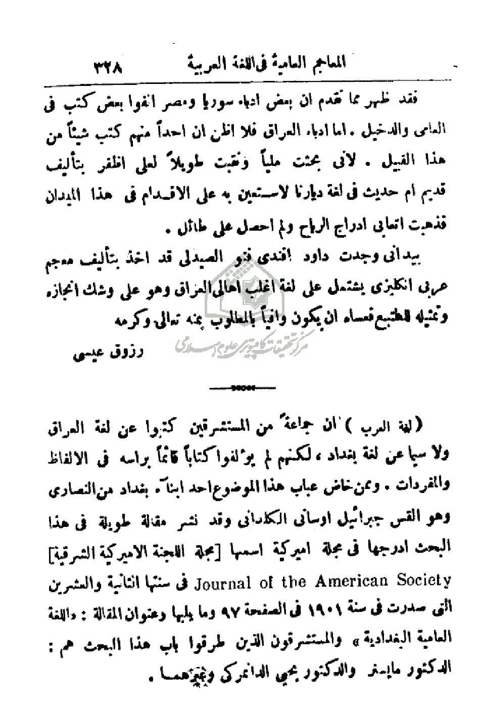 (لغة العرب) أن جماعةً من المستشرقين كتبوا عن لغة العراق ولا سيما عن لغة بغداد، لكنهم لو يؤلفوا كتاباً قائماً برأسه في الألفاظ والمفردات. ومم خاض عباب هذا الموضوع أحد أبناء بغداد من النصارى وهو القس جبرائيل أوساني الكلدانى وقد نشر مقالة طويلة في هذا البحث أدرجها في مجلة أميركية اسمها (مجلة اللجنة الأميركية الشرقية) في سنتها الثانية والعشرين التي صدرت في سنة 1901 في الصفحة 97 وما يليها وعنوان المقالة: (اللغة العامية البغدادية) والمستشرقون الذين طرقوا باب هذا البحث هم: الدكتور ماينر والدكتور يحيى الدانمركي وغيرهما.