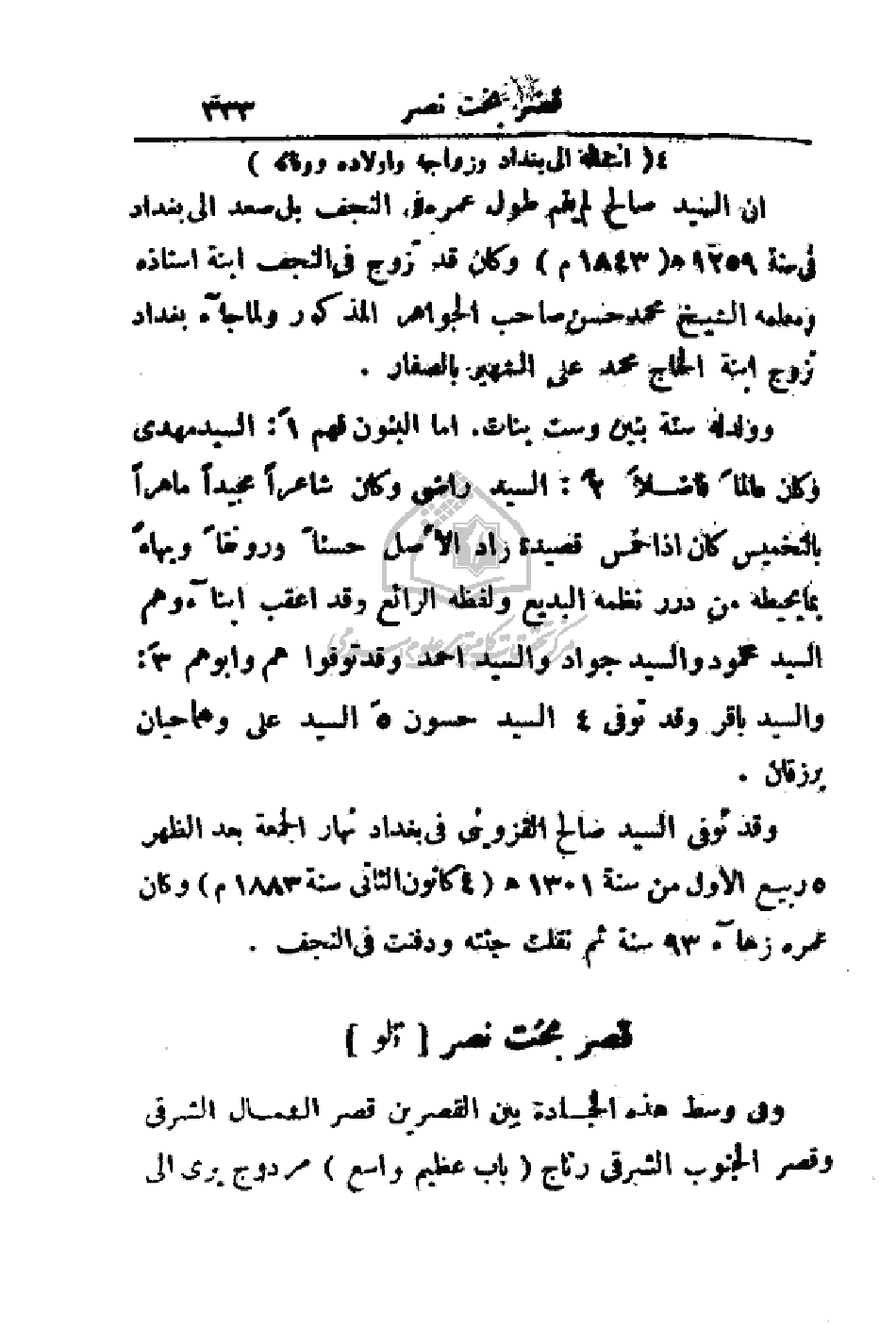 إن السيد صالح لم يقم طول عمرهِ في النجف يل صعد إلى بغداد في سنة 1259هـ (1843م) وكان قد تزوج في النجف ابنة أستاذه ومعلمه الشيخ محمد حسن صاحب الجواهر المذكور ولما جاء بغداد تزوج ابنة الحاج محمد علي الشهير بالصفار.