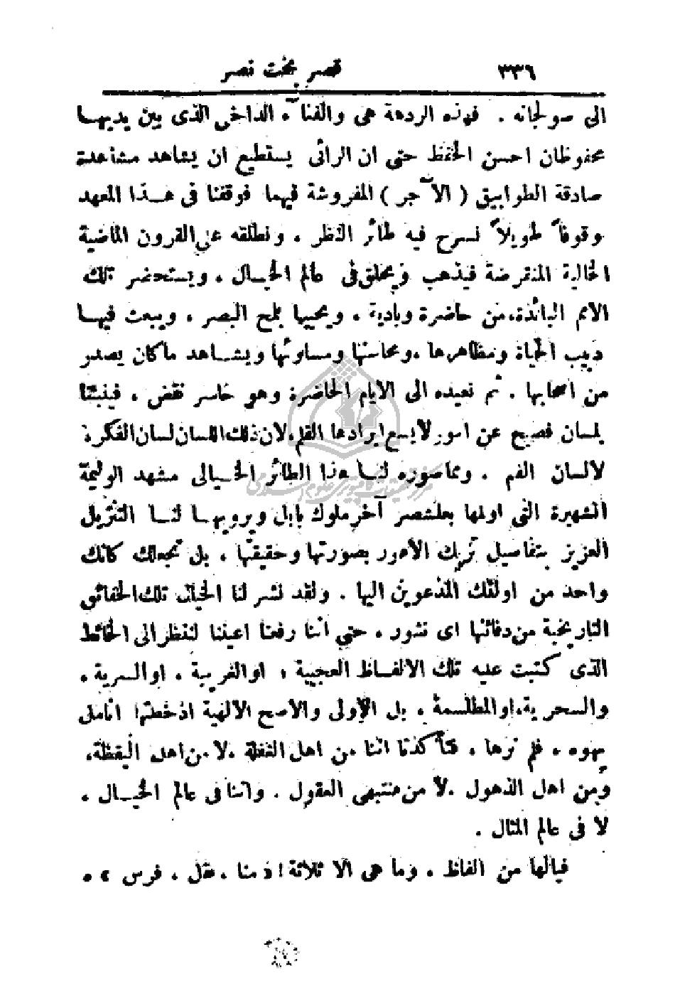أصحابها. ثم نعيده إلى الأيام الحاضرة وهو حاسر نقض، فينبئنا بلسان فصيح عن أمور لا يسع إيرادها القلم، لان ذلك اللسان لسان الفكر، لا لسان الفم. ومما صوره لنا هذا الطائر الخيالي مشهد الوليمة الشهيرة التي أولمها بلعشصر آخر ملوك بابل ويرويها لنا التنزيل العزيز بتفاصيل تريك الأمور بصورتها وحقيقتها، بل تجعلك كأنك واحد من أولئك المدعوين إليها. ولقد نشر لنا الخيال تلك الحقائق التاريخية من دفائنها أي نشور، حتى إننا رفعنا لننظر إلى الحائط الذي كتبت عليه تلك الألفاظ العجيبة، أو الغريبة، أو السرية، والسحرية، أو المطلسمة، بل الأولى والأصح الإلهية إذ خطتها أنامل يهوه، فلم نرها، فتأكدنا إننا من أهل الغفلة، لا من أهل اليقظة، ومن أهل الذهول، لا من منتبهي العقول. وإننا في عالم الخيال، لا في عالم المثال.