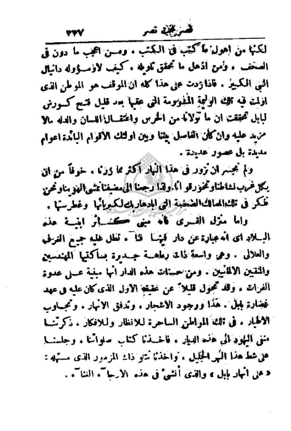 وأما منزل القرى فانه مبنى كسائر أبنية هذه البلاد أي انه عبارة عن دار فيها فناء تطل عليه جميع الغرف والعلالي. وهي واسعة ذات رفاهة جديرة بساكنيها المهندسين والمنقبين الألمانيين. ومن حسنات هذه الدار إنها مبنية على عدوة الفرات، وقد تحول قليلاً عن عقيقه الأول الذي كان عليه في عهد غضارة بابل. هذا ووجود الأشجار، وتدفق الأنهار، وتجاوب الاطيار، في تلك المواطن الساحرة للأنظار وللأفكار، ذكرينا منفى اليهود إلى هذه الديار، فأخذنا كتاب صلواتنا، وجلسنا على شط هذا النهر الجليل، وأخذنا نتلو ذاك المزمور الذي مستهله: (على انهار بابل) والذي انشأ في هذه الأرجاء الغناء.