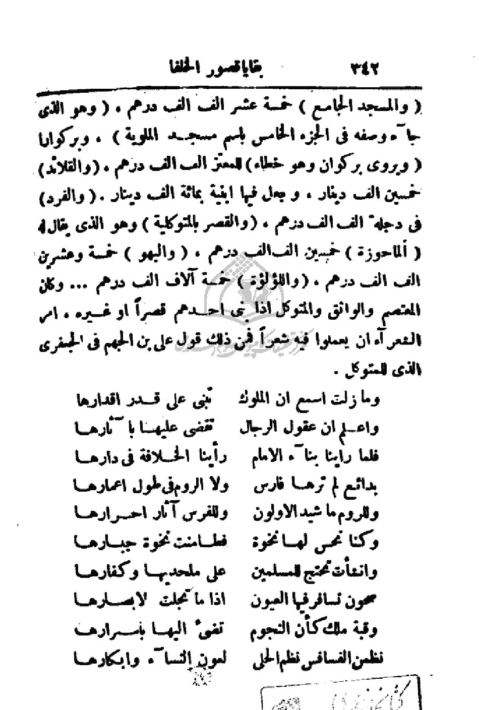 باسم مسجد الملوية)، وبركوارا (ويروى بركوان وهو خطاء) للمعتز ألف ألف درهم، (والقلائد) خمسين ألف دينار، وجعل فيها أبنية بمائة ألف دينار. (والفرد) في دجلة ألف ألف درهم، (والقصر بالمتوكلية) وهو الذي يقال له (الماحوزة خمسين ألف ألف درهم. (والبهو) خمسة وعشرين ألف ألف درهم، (واللؤلؤة خمسة آلاف ألف درهم. . . وكان المعتصم والواثق والمتوكل إذا بنى أحدهم قصراً أو غيره، أمر الشعراء أن يعلموا فيه شعراً فمن ذلك قول على بن الجهم في الجعفري الذي للمتوكل: