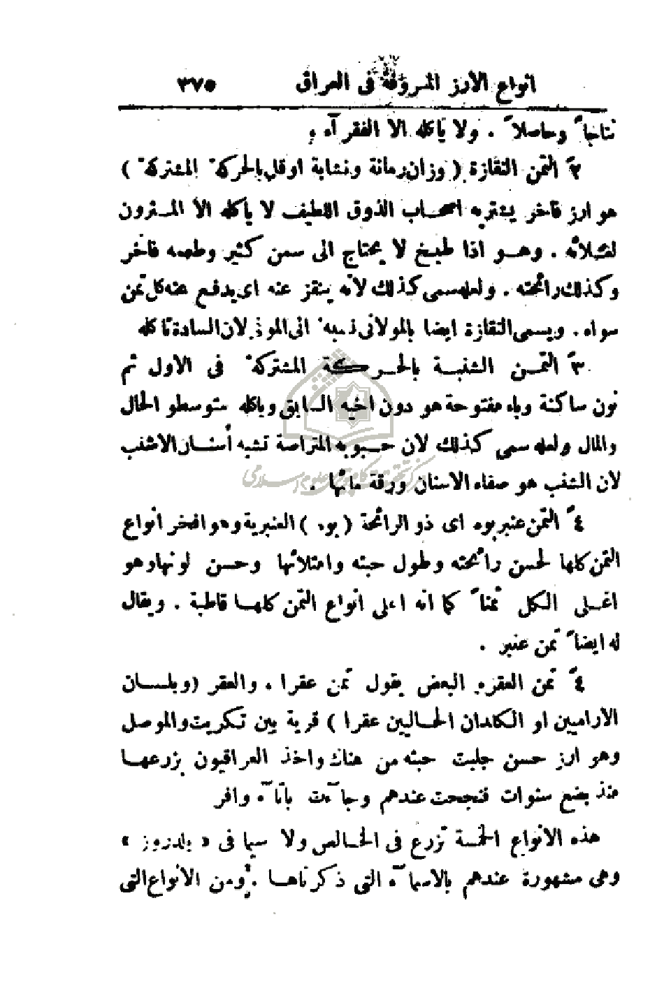 5 - تمن العقر. البعض يقول تمن عقرا، والعقر (وبلسان الآراميين أو الكلدان الحاليين عقرا) قرية بين تكريت والموصل وهو أرز حسن جلبت حبثه من هناك واخذ العراقيون بزرعها منذ بضع سنوات فنجحت عندهم وجاءت بإيتاء وافر