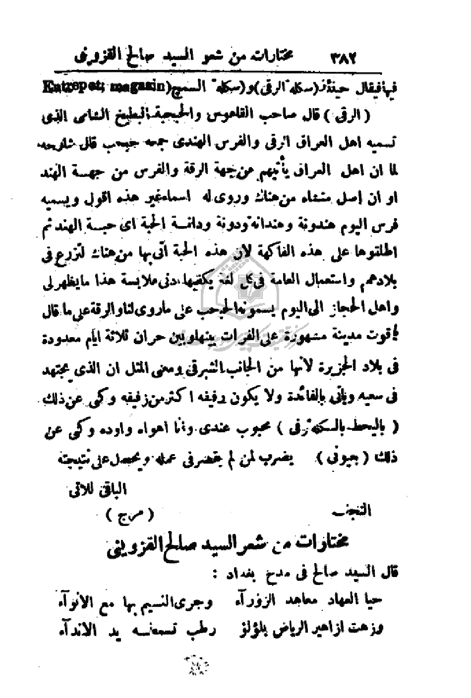 (الرقي) قال صاحب القاموس والحبحبة البطيخ الشامي الذي تسميه أهل العراق يأتيهم من جهة الرقة والفرس من جهة الهند أو أن اصل منشأه من هناك وروى له أسماء غير هذه أقول ويسميه فرس اليوم هندونة وهندانة ودونة ودانة الحبة أي حبة الهند ثم أطلقوها على هذه الفاكهة لان هذه الحبة أتى بها من هناك لتزرع في بلادهم واستعمال العامة في كل لغة يكفيها أدنى ملابسة هذا ما يظهر لي وأهل الحجاز إلى اليوم يسمونه الحبحب على ما روي لنا والرقة على ما قال ياقوت مدينة مشهورة على الفرات بينها وبين حران ثلاثة أيام معدودة في بلاد الجزيرة لأنها من الجانب الشرقي ومعنى المثل أن الذي يجتهد في سعيه ويأتي بالفائدة ولا يكون رفيفه اكثر من زفيفه وكنى عن ذلك (باليحط بالسكلة رقي) محبوب عندي وأنا أهواه وأوده وكنى عن ذلك (بعيوني) يضرب لمن لم يقصر في عمله ويحصل على نتيجته