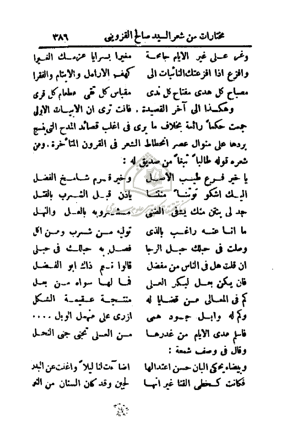 وهكذا إلى آخر القصيدة، فأنت ترى أن الأبيات الأولى جمعت حكما رائعة بخلاف ما يرى في اغلب قصائد المدح التي ينسج بردها على منوال عصر انحطاط الشعر في القرون المتأخرة. ومن شعره قوله طالباً تبغاً من صديق له: