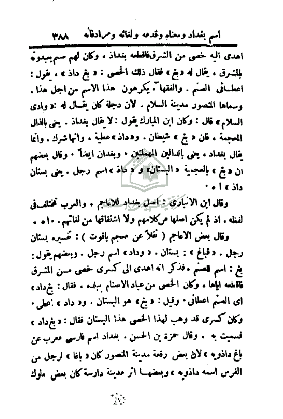 وقال ابن الانباري: أصل بغداد للأعاجم. والعرب تختلف في لفظه، إذ لم يكن اصلها من كلامهم ولا اشتقاقها من لغاتهم. . اهـ.