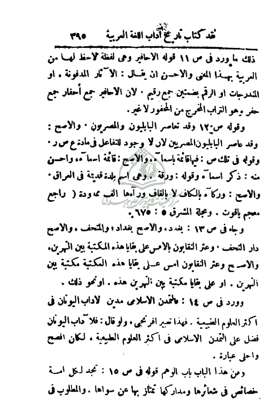 وورد في ص14: فالتمدن الإسلامي مدين لآداب اليونان في اكثر العلوم الطبيعية. فهذا تعبير إفرنجي، ولو قال: فلآداب اليونان فضل على التمدن الإسلامي في اكثر العلوم الطبيعية، لكان افصح وأحلى عبارة.