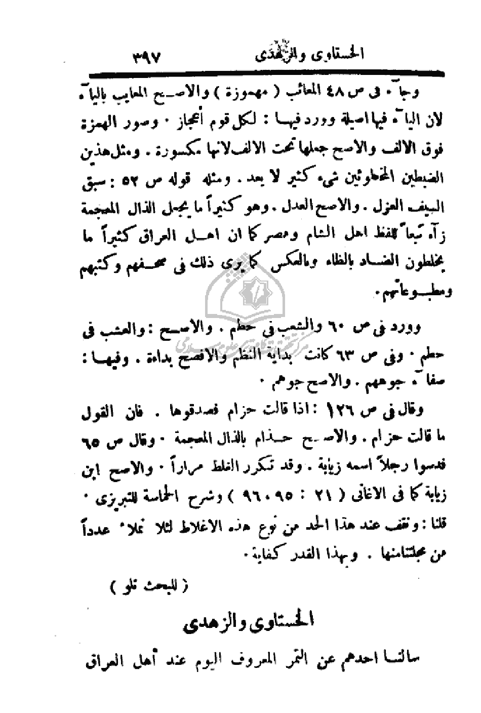 وجاء في ص48 المعائب (مهموزة) والأصح المعايب بالياء لان الياء فيها أصيلة وود فيها: لكل قوم أعجاز. وصور الهمزة فوق الألف والأصح جعلها تحت الألف لأنها مكسورة. ومثل هذين الضبطين المخطوئين شيء كثير لا يعد. ومثله قوله ص52: سبق السيف العزل. والأصح العذل. وهو كثيراً ما يجعل الذال المعجمة زاء تبعا للفظ أهل الشام ومصر كما أن أهل العراق كثيراً ما يخلطون الصاد بالظاء وبالعكس كما يرى ذلك في صحفهم وكتبهم ومطبوعاتهم.
