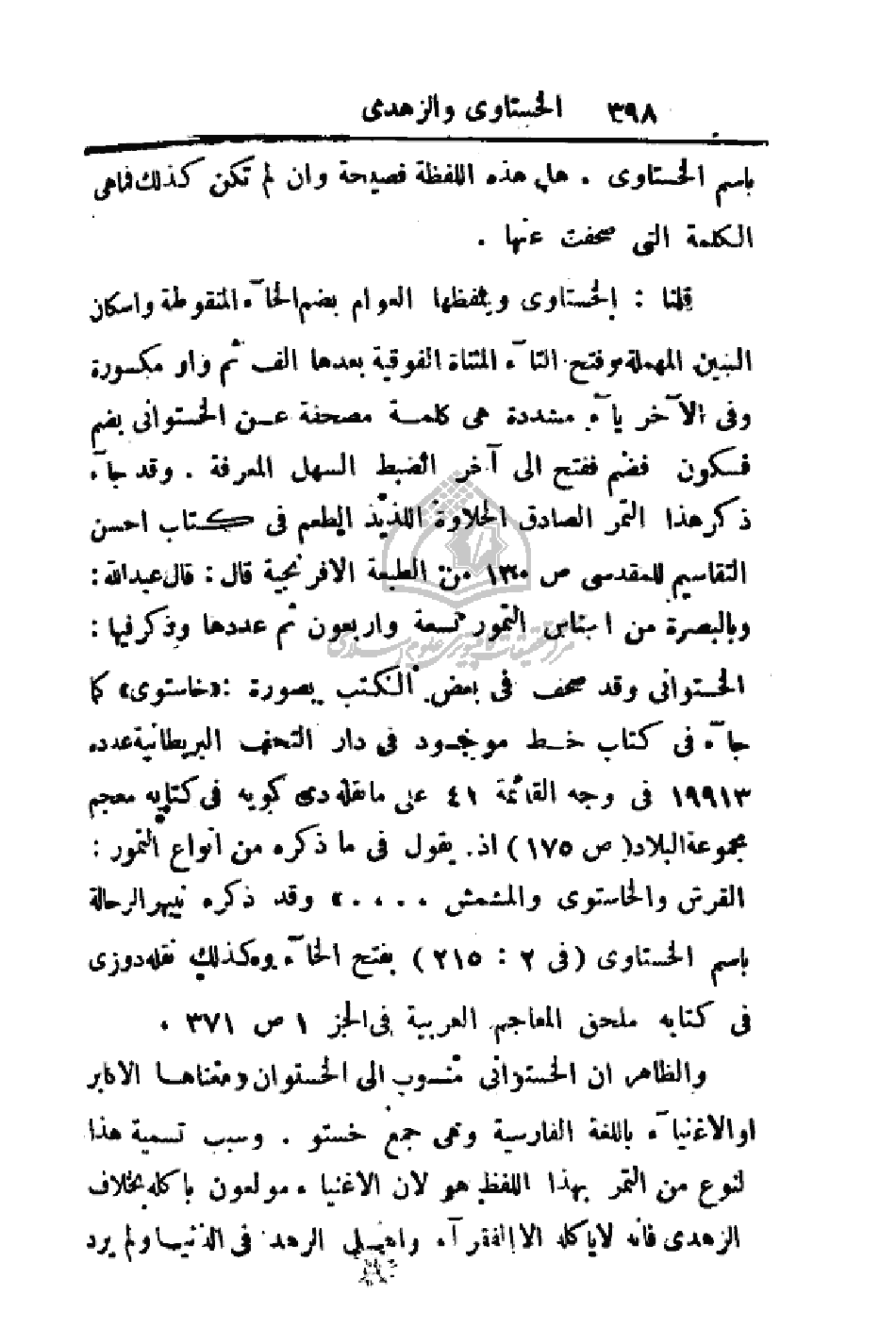 قلنا: الخستاوي ويلفظها العوام بضم الخاء المنقوطة وإسكان السين المهملة وفتح التاء المثناة بعدها ألف ثم واو مكسورة وفي الآخر باء مشددة هي كلمة مصحفة عن الخستواني بضم فسكون فضم ففتح إلى آخر الضبط السهل المعرفة. وقد جاء ذكر هذا التمر الصادق الحلاوة اللذيذ الطعم في كتاب احسن التقاسيم للمقدسي ص130 من الطبعة الإفرنجية قال: عبد الله: وبالبصرة من أجناس التمور تسعة وأربعون ثم عددها وذكر فيها: الخستواني وقد صحف في بعض الكتب بصورة: (خاستوي) كما جاء في كتاب خط موجود في دار المتحف البريطانية عدده 19913 في وجه القائمة 41 على ما نقله دي كويه في كتابه معجم مجموعة البلاد (ص175) إذ يقول في ما ذكره من أنواع التمور: القرش والخاستوي والمشمش. . . .) وقد ذكره نيبهر الرحالة باسم الخستاوي (في 2: 215) بفتح الخاء وكذلك نقله دوزي في كتابه ملحق المعاجم العربية في الجزء 1 ص 371،