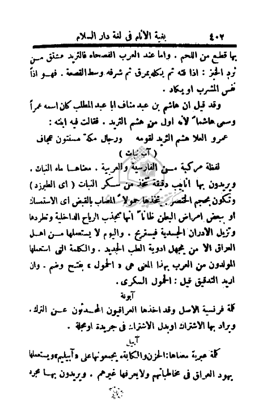 بها قطع اللحم. وأما عند العرب الفصحاء فالثريد مشتق من ثرد الخبز: إذا فته ثم بكله بمرق ثم شرفه وسط القصعة. فهو إذا نفس المشرب أو يكاد.