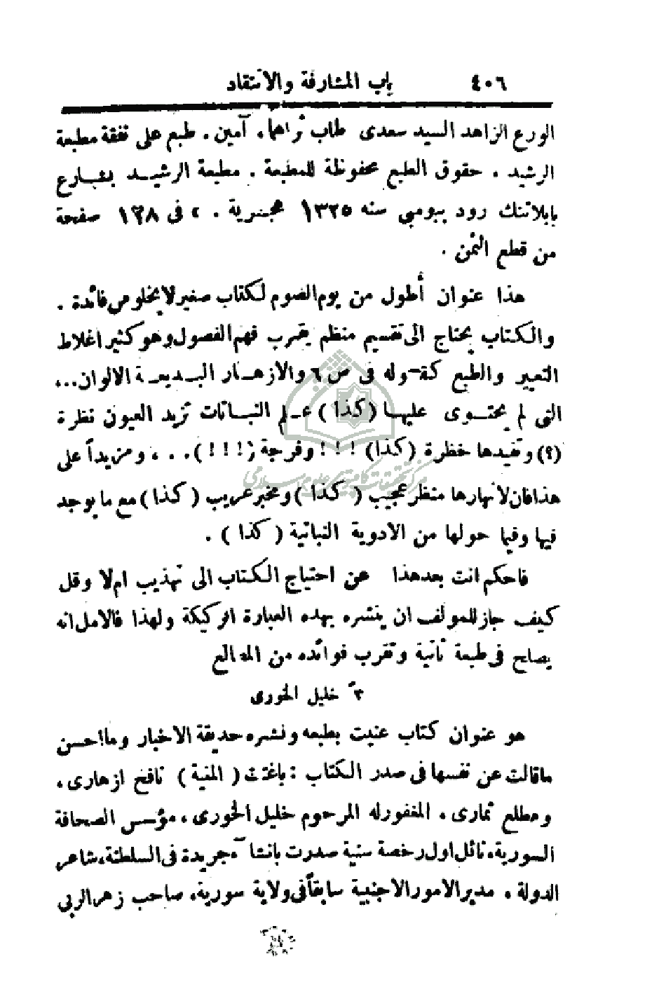 بهذه العبارة الركيكة ولهذا فالأمل انه يصلح في طبعة ثانية وتقرب فوائده من المطالع.