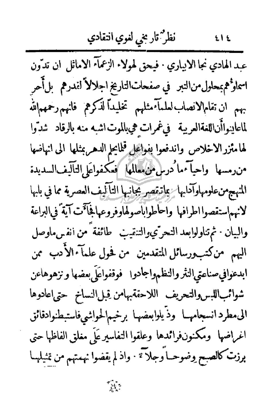 عبد الهادي نجا الابياري. فيحق لهؤلاء الزعماء الأماثل أن تدون أسماؤهم بمحلول من التبر في صفحات التاريخ إجلالا لقدرهم بل أحر بهم أن تقام الأنصاب لعلماء مثلهم تخليداً لذكرهم فانهم رحمهم الله لما عاينوا أن اللغة العربية في غمراتٍ هي بالموت أشبه منه بالرقاد شدوا لها مئزر الإخلاص واندفعوا بفواعل قلما يحلم الدهر بمثلها إلى إنهاضها من رمسها وأحياء ما درس من معالمها فعطفوا على التأليف السديدة المنهج من علومها وآدابها بما تقصر بجانبها التأليف العصرية مما في بابها لأنهم استقصوا أطرافها وأحاطوا بأصولها وفروعها فجاءت آيةٍ في البراعة والبيان. ثم تناولوا بعد التحري والتنقيب طائفة من انفس ما وصل إليهم من كتب ورسائل المتقدمين من فحول علماء الأدب ممن أبدعوا في صناعتي النثر والنظم وأجادوا فوقفوا على بعضها ونزهوها عن شوائب اللبس والتحريف اللاحقة بها من قبل النساخ حتى أعادوا إلى مطرد انسجامها وذيلوا بعضها برخيم الحواشي فاستبطنوا دقائق أغراضها ومكنون فرائدها وعلقوا التفاسير على مغلق ألفاظها حتى برزت كالصبح وضوحاً وجلاءً. وإذ لم يقضوا نهمتهم من تمثيلها