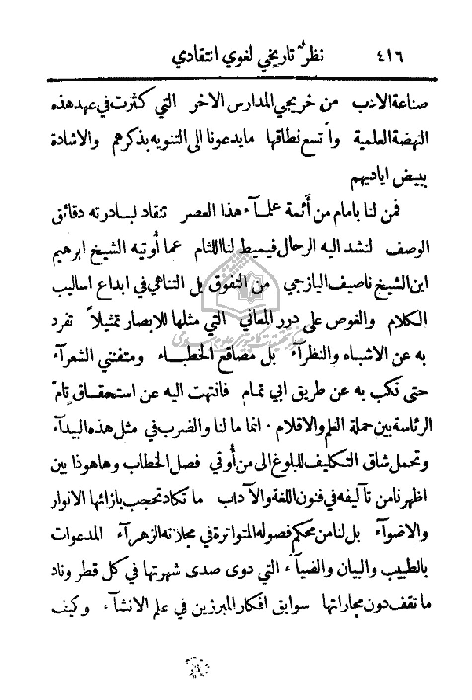 فمن لنا بإمام من أئمة علماء هذا العصر تنقاد لبادرته دقائق الوصف لنشد إليه الرحال فيميط لنا اللثام عما أوتيه الشيخ إبراهيم ابن الشيخ ناصيف اليازجي من التفوق بل التناهي في إبداع أساليب الكلام والغوص على درر المعاني التي مثلها للأبصار تمثيلاً تفرد به عن الأشباه والنظراء بل مصاقع الخطباء ومتفنني الشعراء حتى نكب به عن طريق أبي تمام فانتهت إليه عن استحقاقٍ تام الرئاسة بين حملة العلم والأقلام. إنما ما لنا والضرب في مثل هذه البيداء وتحمل مشاق التكليف للبلوغ إلى من أوتى فصل الخطاب وهاهو ذا بين أظهرنا من تأليفه في فنون اللغة والآداب ما تكاد تحتجب بازائها الأنوار والأضواء والبيان والضياء التي دوى صدى شهرتها في كل قطر وناد ما تقف دون مجاراتها سوابق أفكار المبرزين في علم الإنشاء وكيف